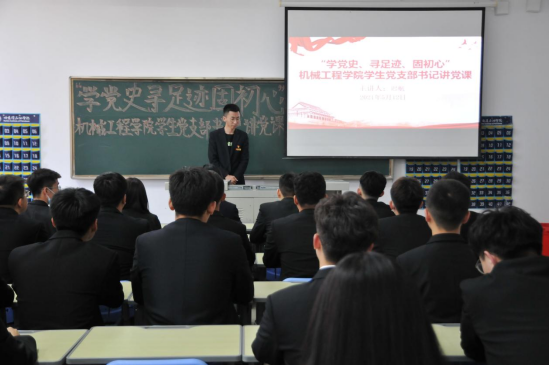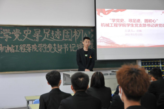 课上,学生党支部书记迟航强调,学党史是一次把握历史、把握规律、把握未来的思想政治理论大学习,也是一次牢记初心与使命的党性实践教育良好契机。机械工程学院学生党支部将全面把党史学习融入学生党建工作,继续在学生党支部中开展特色鲜明的主题教育活动。由党支部书记带头学、深入学、引领学,使学生党员牢固树立“四个自信”,学院也将由学而行,开展系列实践教育活动,充分发挥、彰显学生党支部的战斗堡垒作用。