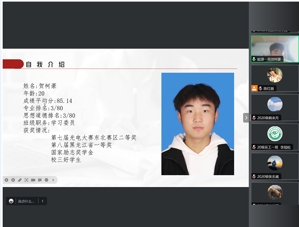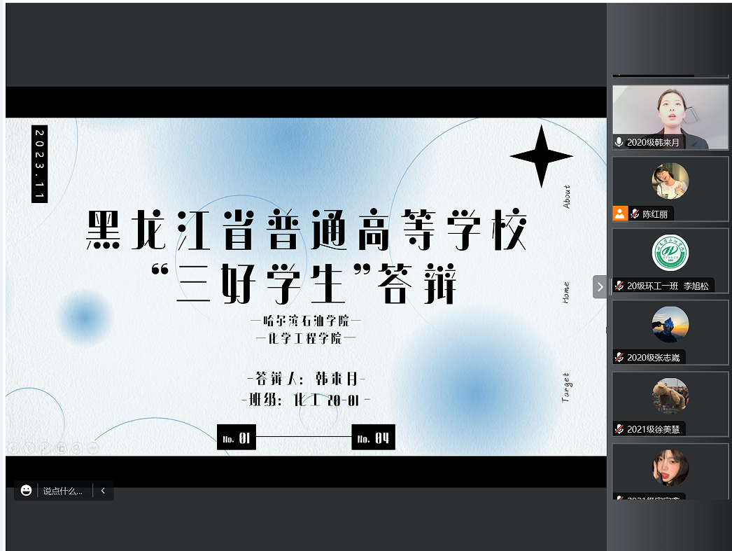 答辩会上,赵婧老师宣读黑龙江省三好学生评选流程、评选办法及评选条件后,21名申请人结合PPT依次进辩。申请人从自我介绍、思想政治表现、学习成绩、学科竞赛、社会实践、志愿服务等各个方面取得的突出成绩进行答辩。每位参与答辩的化工学子始终秉持着在生活和学习中积极向上、帮助同学的初心,努力学好专业知识、专业技能,发挥先锋模范作用。根据评审小组成员的评分,确定学院最终推荐名单:2020级:李旭松、韩来月、王浩诚、高怡轩、李文阅;2021级:宋宇鑫、张凤玉、刘骏、李丹、徐美慧、李佳茹、魏明洋、赵晨曦、吴新钰;2022级:陈蕊、崔垿婧、孙苏钰、陈红丽、贺柯豪、杨康。党总支书记徐宏莉对此次评审答辩会进行总结,她对参加答辩的同学所取得的成绩给予了充分肯定,同时也鼓励化工学子们勇于展示自我,积极参与学术、科研、创新创业等活动,希望同学们不忘初心,肩负时代使命,相信自己,努力拼搏,勇往直前,在未来书写美丽人生。