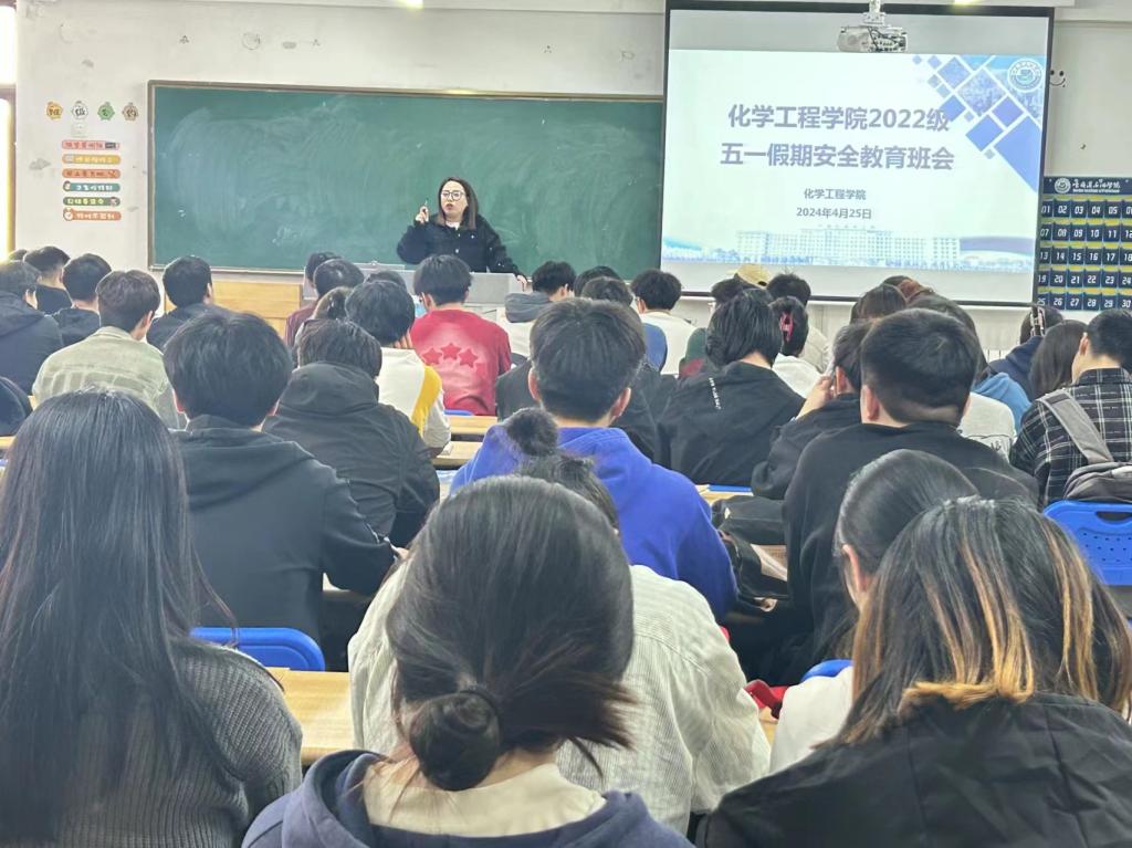 为进一步增强学生们的安全防范意识,提高自我管理的能力,保证学生假期出行安全。2024年4月23日至27日,化学工程学院以线上线下结合的方式召开五一假期安全教育主题班会,会议由各年级辅导员老师主讲,2021级、2022级、2023级全体学生参加。