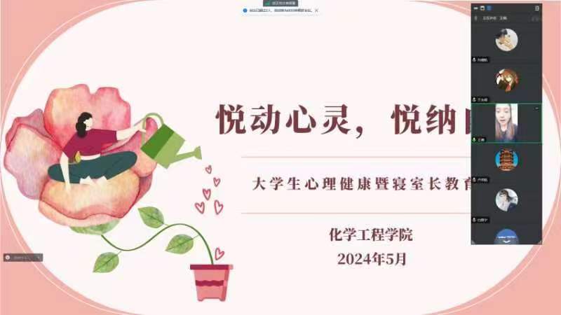 为进一步关注学生心理健康,促进学生全面发展,充分发挥寝室长在宿舍管理中的示范引领和纽带作用。2024年5月22日,化学工程学院于线上开展“悦动心灵 悦纳自我”的大学生心理健康教育。2020级辅导员王喃及2023级全体寝室长参加本次会议。