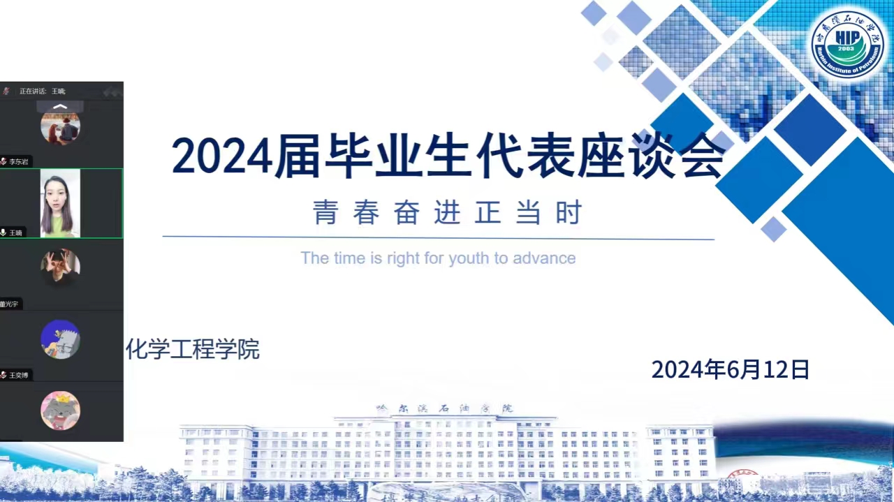 为加强学院与毕业生的沟通交流,引导毕业生系好走向社会的“第一粒扣子” ,2024年6月12日,化学工程学院于线上开展“青春奋进正当时”2024届毕业生代表座谈会。2020级辅导员王喃及2020级毕业生代表参加会议。