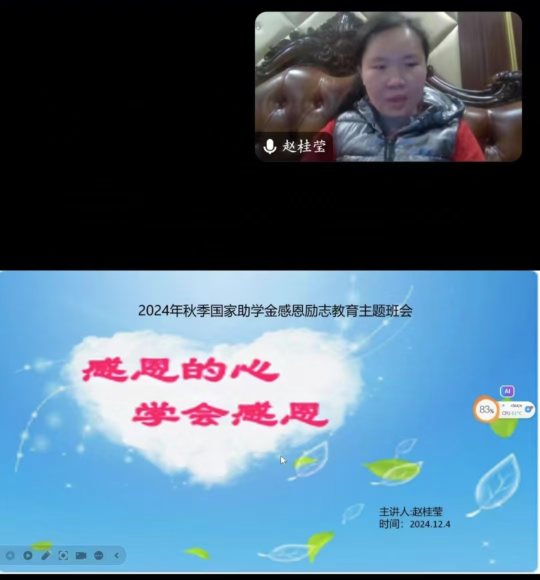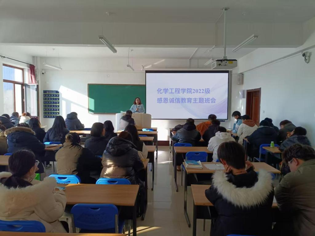 为深入贯彻落实党的二十大精神,进一步强化资助育人效果,广泛宣传资助育人成果,增强当代大学生诚信感恩意识和责任担当,2024 年 12 月 11 日,化学工程学院开展“感恩、诚信、励志”教育主题班会。班会由各年级辅导员主持,21 级、22 级、23 级、24 级全体学生参加。