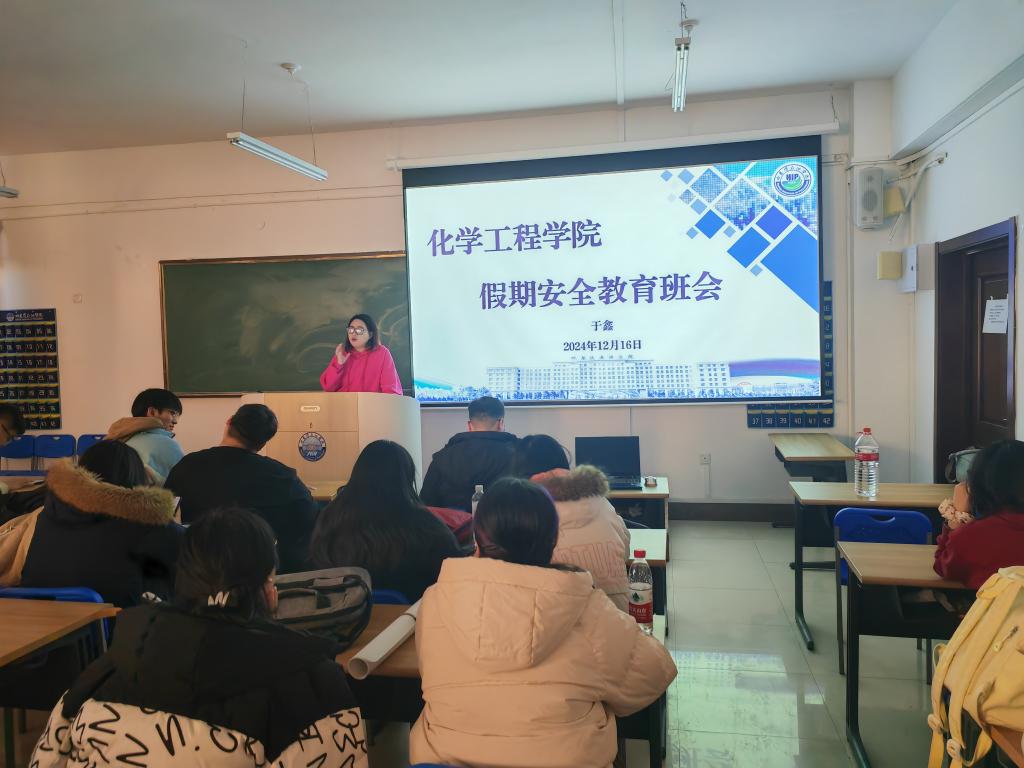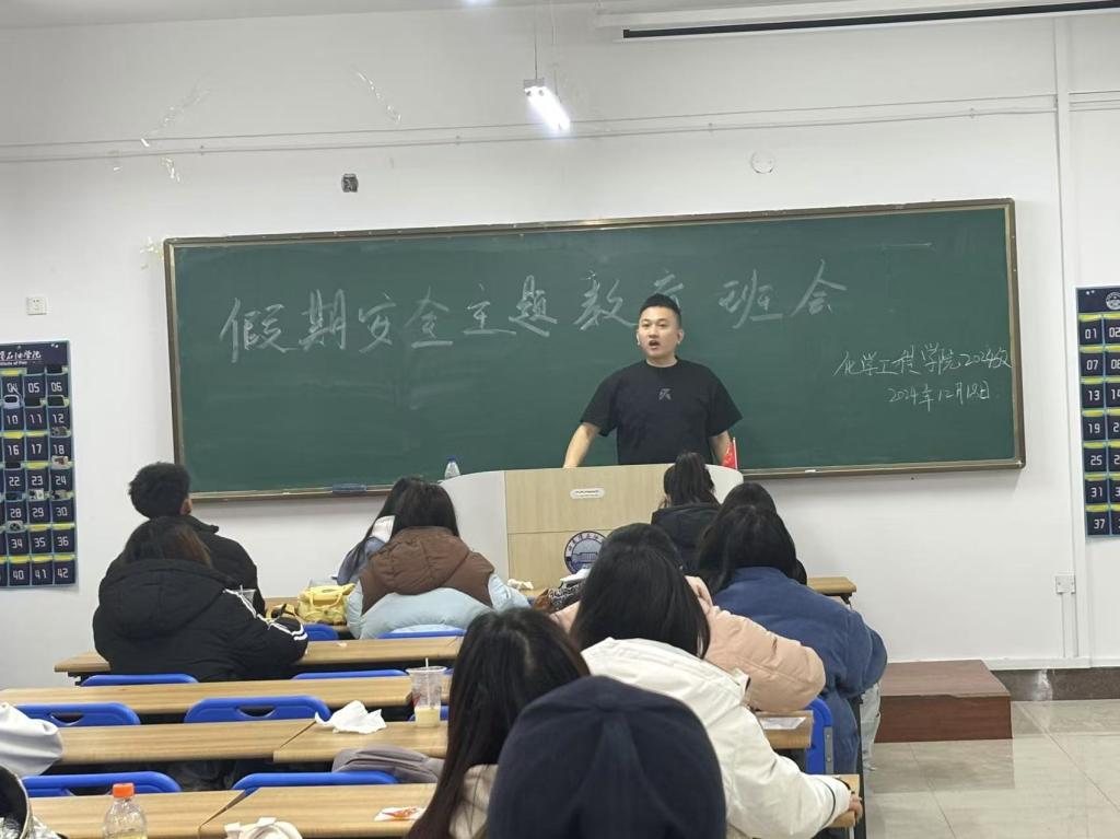 寒假将至,为做好放假期间学生安全工作,保障学生生命安全,确保校园安全稳定,化学工程学院于2024年12月16日—12月18日召开假期安全教育主题班会,会议由各年级辅导员主持,全体同学参加。