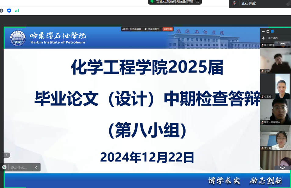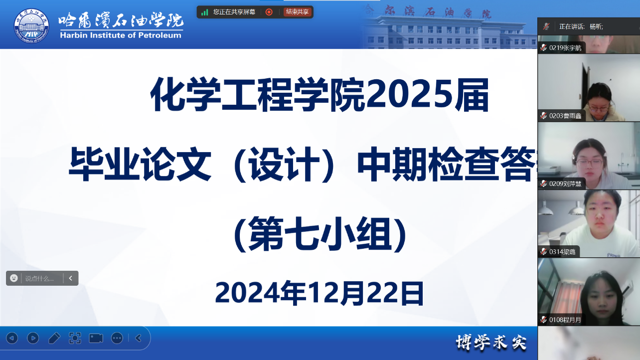 12月22日,学院组织中期检查线上答辩。将学生分成九组,利用PPT汇报论文的完成进展情况,针对未完成的任务给出了具体的完成时间,并提出了目前所面临的困难。答辩教师针对毕业论文(设计)中存在的困难问题给出了相应的解决措施,并对进展相对缓慢的学生,进行了严格督促。