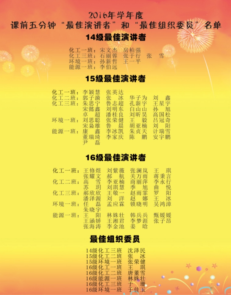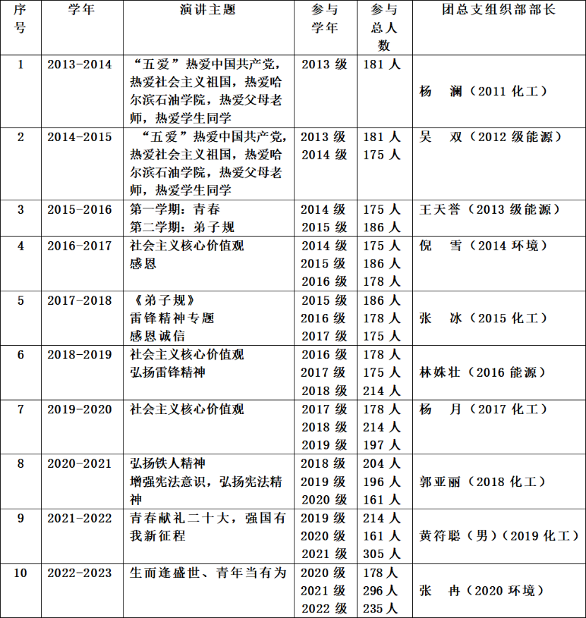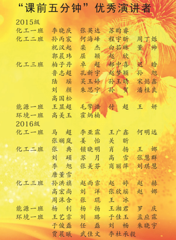 二、十年间实现从无到有的突破,不积跬步,无以至千里,不积小流,无以成江海。 自2013年秋季学期筹划,2014年春季学期开展以来,化学工程学院课前五分钟演讲活动已然成为学院党团工作的特色工作之一,十年来课前五分钟演讲活动累计参与人数达2007人、5082人次,在课前五分钟演讲考核中共评选出最佳组织者37人最佳演讲者396人。新冠肺炎疫情期间,伴随着线下上课情况,课前五分钟演讲活动开展的断断续续,但始终坚持着。每天早上8:00准时开始的课前五分钟演讲,一方面给学生干部一个历练组织沟通管理能力的平台;另一方面也锻炼了学生的语言表达能力,提供了敢于人前说话的机会,增强了人际交往自信心;第三方面,几乎杜绝了全院上课迟到现象。十年来,通过课前五分钟演讲活动,加强学生政治思想教育实效,树牢“四个意识”,坚定“四个自信”,坚决做到“两个维护”,引导教育全院学生汲取铁人精神信仰力量,激发昂扬斗志,践行社会主义核心价值观,培养一届又一届合格的大学生和社会主义可靠的建设者和接班人。值此学校二十周年校庆之际,感谢十年来,为化学工程学院组织开展课前五分钟演讲的历届组织部部长。