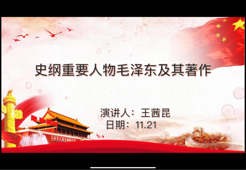 王茜昆讲解了史纲重要人物毛泽东及其著作,通过第一次国内革命战争时期、土地革命战争时期、全民族抗战时期、解放战争时期与新中国成立之后,分别对毛泽东同志这四个时期所发表的著作内容进行讲解,使大家更深层次对史纲进行了解。
