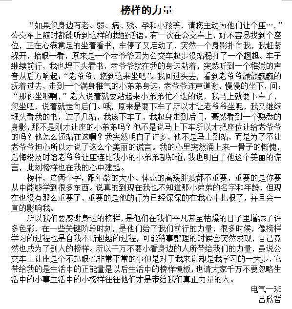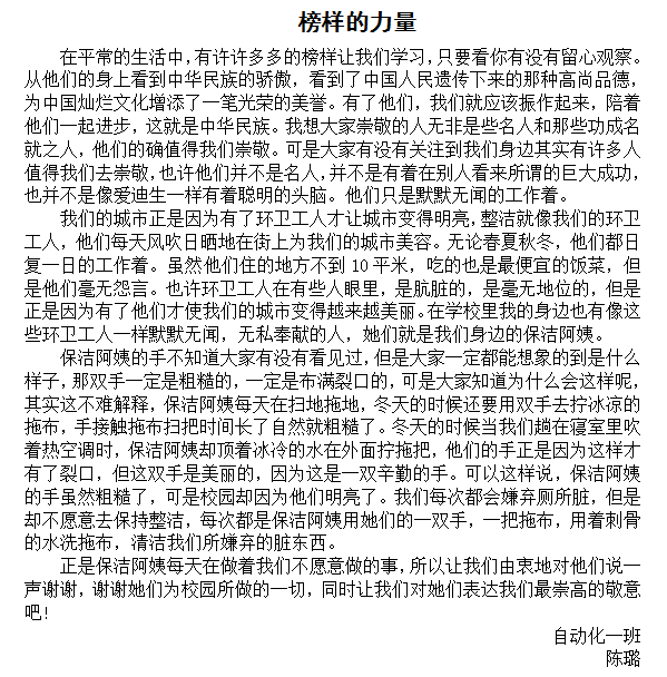 为大力弘扬雷锋热爱党、热爱祖国、热爱社会主义的崇高理想和坚定信念,弘扬雷锋服务人民、助人为乐的奉献精神,弘扬雷锋干一行爱一行、专一行精一行的敬业精神,弘扬雷锋锐意进取、自强不息的创新精神,弘扬雷锋艰苦奋斗、勤俭节约的创业精神,在全院形成学习雷锋、争当雷锋的新热潮,推动社会主义核心价值体系建设。2017年3月10日,自动控制工程学院举办了以“榜样的力量”为主题的征文活动。