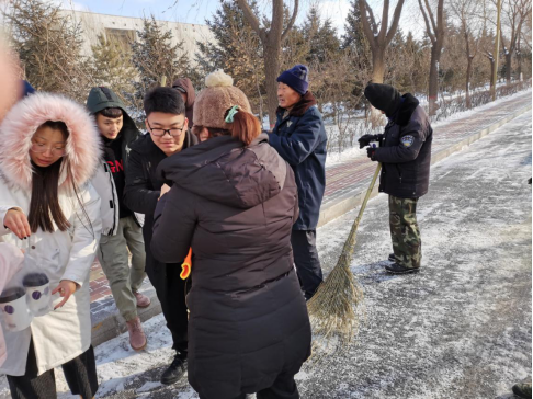 学校公寓管理委员会的学生们提着保温箱,为昼夜兼程清雪奋战的工作人员送去了温暖的奶茶。一杯杯热饮抵御了冬日的寒冷,遣散了困意和疲倦,一股暖流在清雪作业人员的内心回荡。