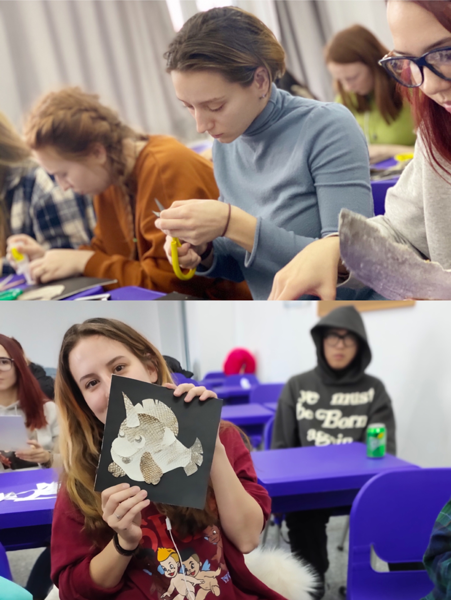 留学生看着这些仿若大自然鬼斧神工的作品,尤其是由鱼皮拼接而成的彩色花鸟图,让在场的许多学生大为惊叹,纷纷讨论并开始制作鱼皮画。