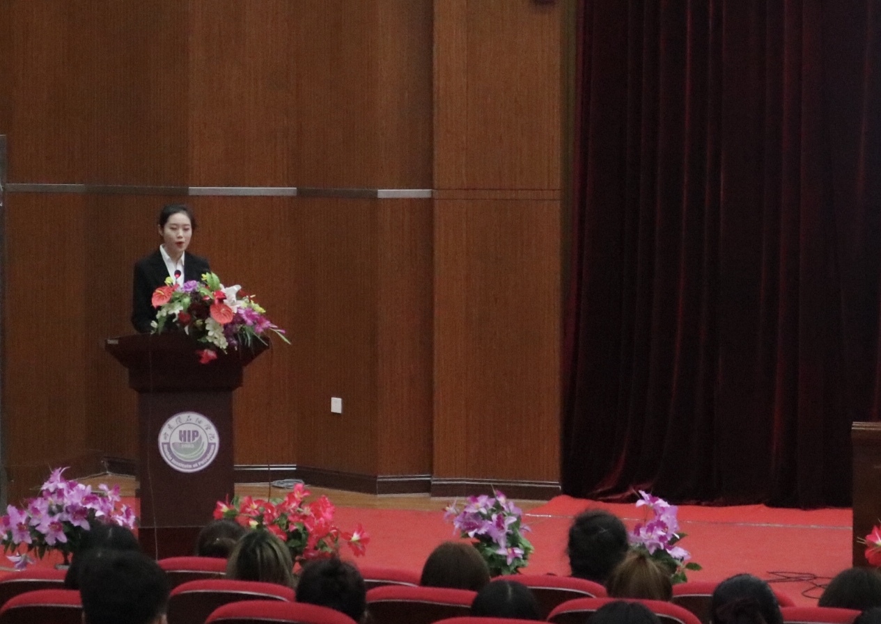 2017级英语专业的薛美辰、赵春江和王超杰三位同学代表全体志愿者汇报了实习的成果和收获。薛美辰同学在世园会担任VIP贵宾讲解员,多次接待中央、省厅的领导,她向全体师生汇报了世园会项目的实施过程、实习生的工作内容和同学们的成长与收获。VIP贵宾接待员赵春江和广播站主任王超杰两位同学从自己的工作角度向师生们分享了实习中遇到的困难、收获和个人的心得体会。他们非常感谢学校和学院能够给同学们提供世园会这样世界一流水平的学习平台,都表示在实习中,虽然遇到了各种各样的困难,但同学们凭着坚忍不拔的毅力、为学院争光的决心克服了种种难题,在世园会中因责任心强、工作表现好、服务水平高而屡次收到世园会管理机构的赞扬和表彰。