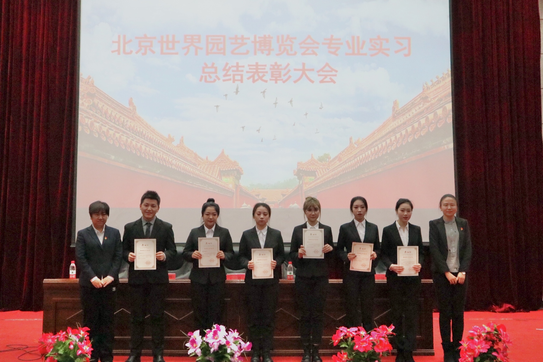 在实习中,邹丹老师全程指导学生在北京世园会工作期间的课程学习和工作,孙晓萍和赵连琦两位老师负责学生的生活管理并多次到北京指导学生实习,世园会向三位老师授予了优秀指导教师的荣誉称号,以表彰三位老师的贡献。