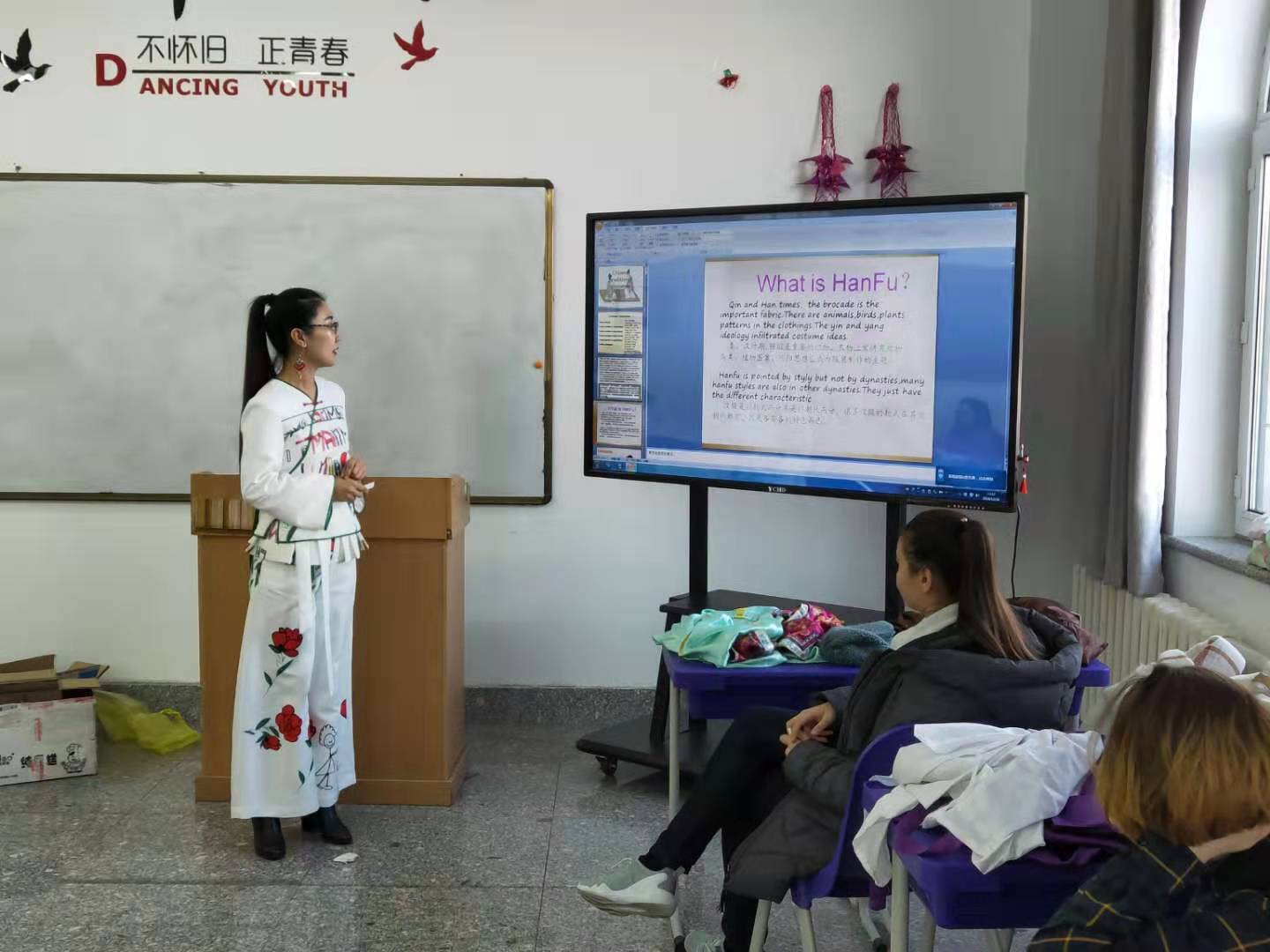 刘芳欣老师以朝代为轴对留学生首先讲解了汉服的起源、传承、发展历程以及汉服的形制做了深入浅出的讲解。为了加强留学生对汉服文化与历史的理解和学习兴趣,老师将不同国家传统服饰进行对比,并讲述了我国古代巾帼英雄花木兰代父从军忠孝节义的事迹,来引起接下来对唐、宋、明、清,四个朝代服饰的着重介绍。