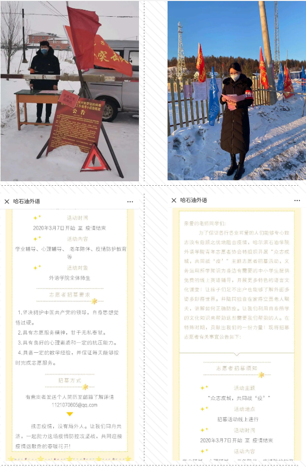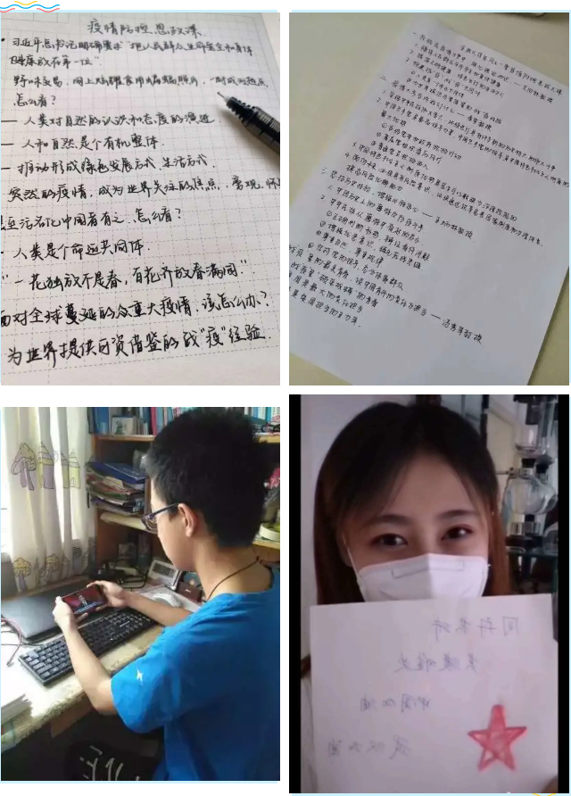 八、外语学院开展劳“疫”结合劳动照片征集活动、防“疫”志愿招募令活动、一心移“疫”慰问志愿者活动在学雷锋活动月期间,外语学院以学习雷锋精神和疫情防控知识为主线开展线上活动,组织开展了防“疫”志愿招募令活动,动员学院师生运用所学知识义务为身边的人提供答疑服务;开展了劳“疫”结合图片征集活动,引导学生开展居家志愿服务活动,进行义务劳动,增进与父母的感情;开展了战“疫”美文征文活动,以诗、文、画来记录防疫工作者的工作场景;开展了一心移“疫”慰问志愿者活动,聆听外语学院疫情防控志愿者的心得体会,引导学生勇担社会责任展现了当代大学生积极踊跃、敢于担当、精诚团结的优秀品质。