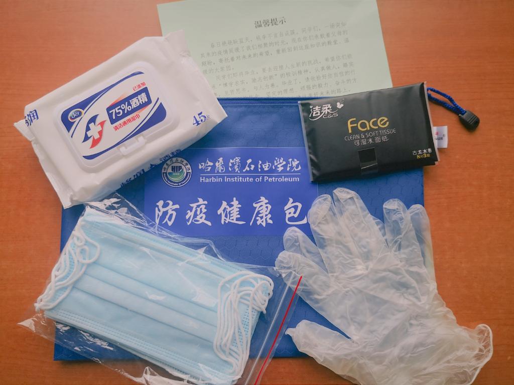 学校为每位返校学生准备了爱心健康防疫包,为同学们准备了酒精湿巾、口罩、手套等必要的防疫物品,各学院还为学生们准备了在校期间温馨提示。学校为每位返校学生提供了在校期间免费无线网络账号,以保障同学们网络畅通。
