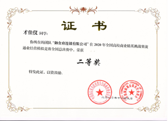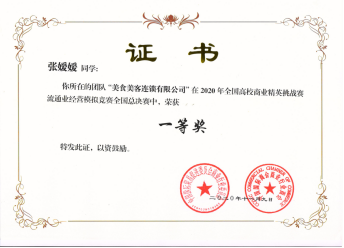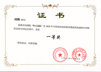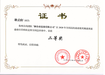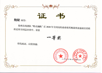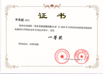 由刘洲、霍增玉、董梦迪三名同学组成的“哈石油队”代表队,及由张媛媛、屈剑飞、刘梦佳、李英超、彭益凡六名同学组成的“美食美客连锁有限公司”代表队也脱颖而出,获得了国家级一等奖的优异成绩,由阿里玛、才佳仪、丁思佳、耿启轩、黄婉、晋胜楠六名同学组成的“御食府连锁有限公司”代表队获得了国家级二等奖的优异成绩。