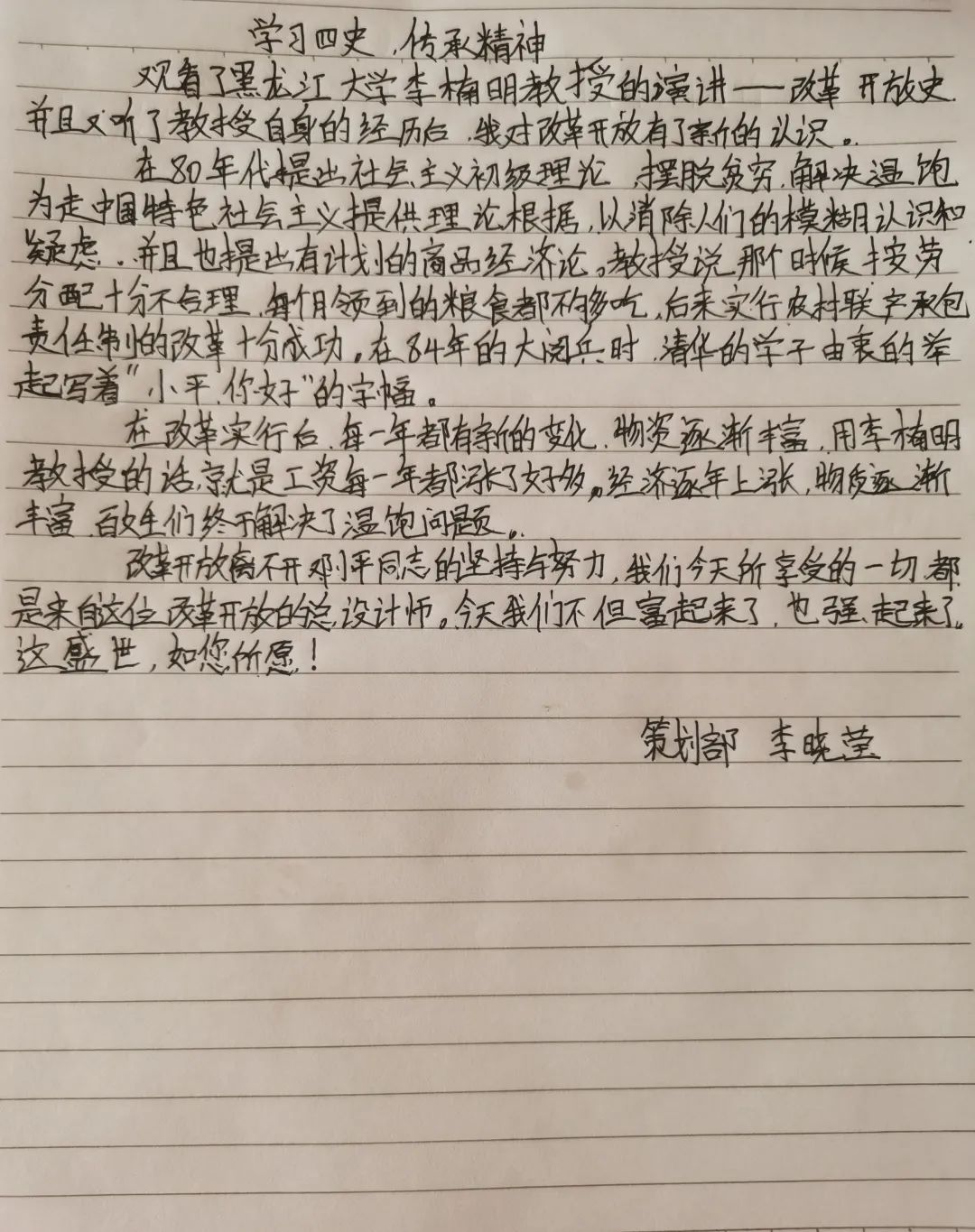 直播中同学们了解了我党创立以来、新中国成立来以及改革开放以来的重大事件、重要会议、重要文件、重要人物,以及我们党领导人民进行的艰苦卓绝的斗争历程,同时大家还了解了中国近代以来的斗争史及我党的光荣传统、宝贵经验和伟大成就。同学们学习过程中深刻了解了“四史”,学习后一一诉说感悟,写下心得。