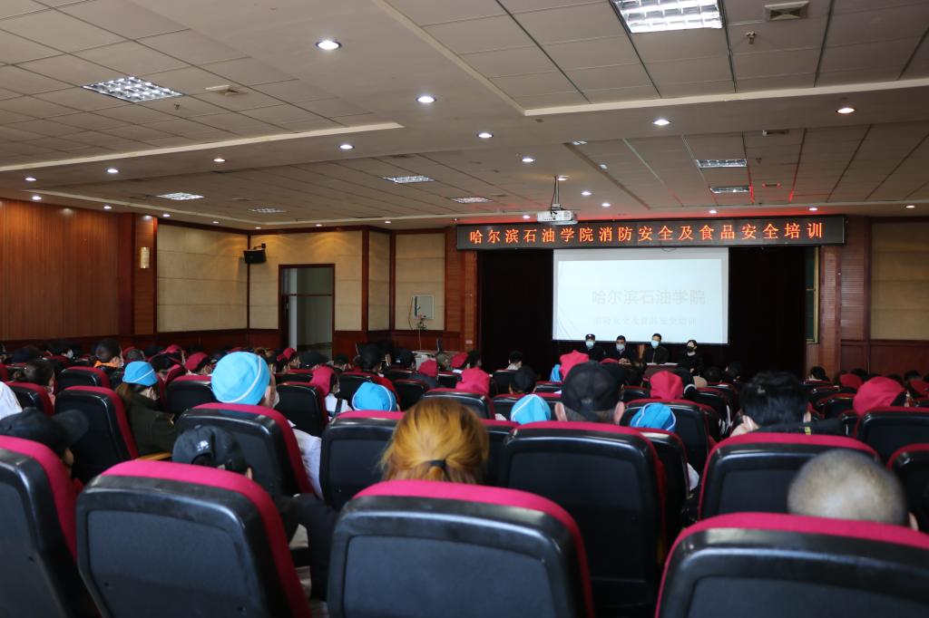 保卫处副处长张学斌、消防科科长赵胜林先后讲解了安全防火知识,住宿员工防火、防盗等内容,通过消防事故案例剖析,就如何防控火灾的发生、正确使用消防设施、组织逃生与开展自救进行了系统的讲解,使参训人员对火灾的危害性有了一个直观的感受,切实提升做好消防安全工作的重要性认识。餐饮中心主任韩冶、副主任刘恩君通过列举鲜明的案例说明餐饮食品安全的严峻形势,同时对《黑龙江省冷链食品新冠病毒防控人物同防技术指南》、《黑龙江省冷链食品新冠病毒防控人物同防消毒技术指南》等文件的重点内容作以简要解读,对疫情期间原料采购贮存、烹调加工、从业人员个人卫生、清洗消毒、外部环境卫生、食品添加剂管控等六个要点进行重点培训,提升从业人员的冷链食品及物品新冠病毒防控和消毒工作技能及食品安全意识。通过以案施教的方式向参训人员普及了食品安全责任和义务、食物安全防控等相关法律法规知识,并现场同四名食堂承包人签订了餐饮疫情防控承诺书。