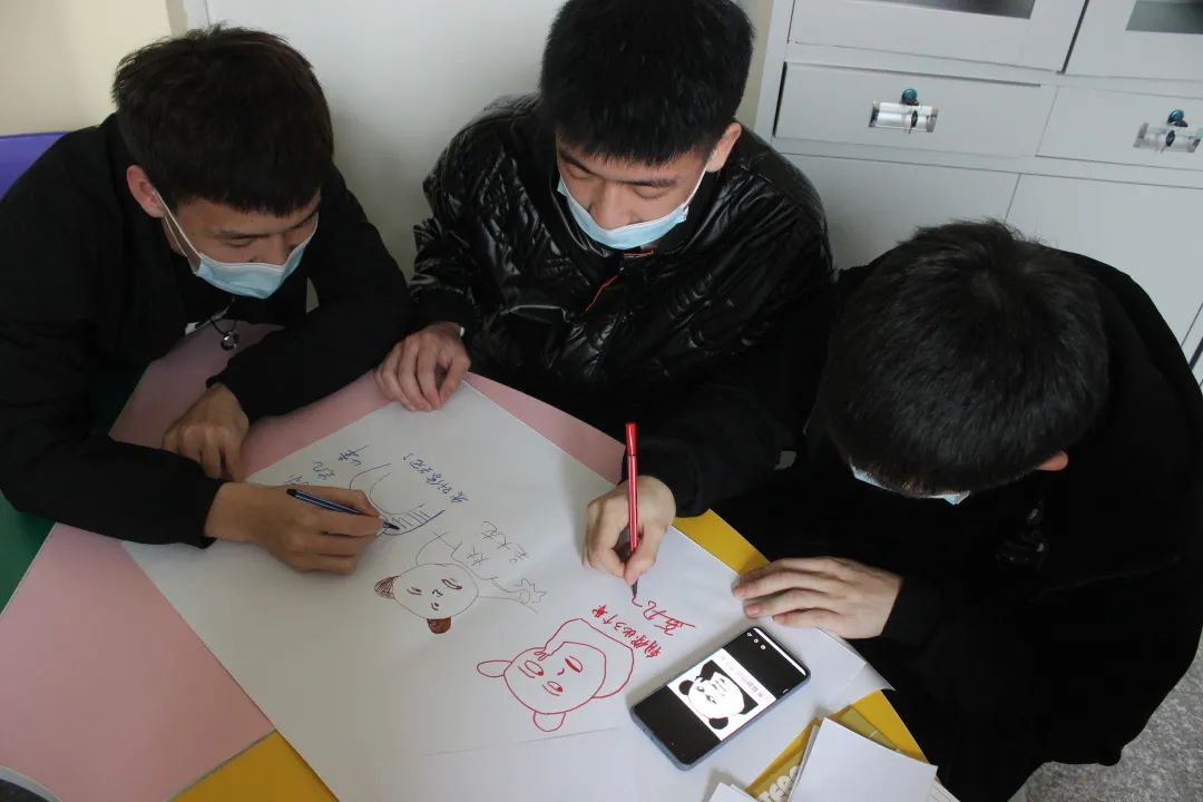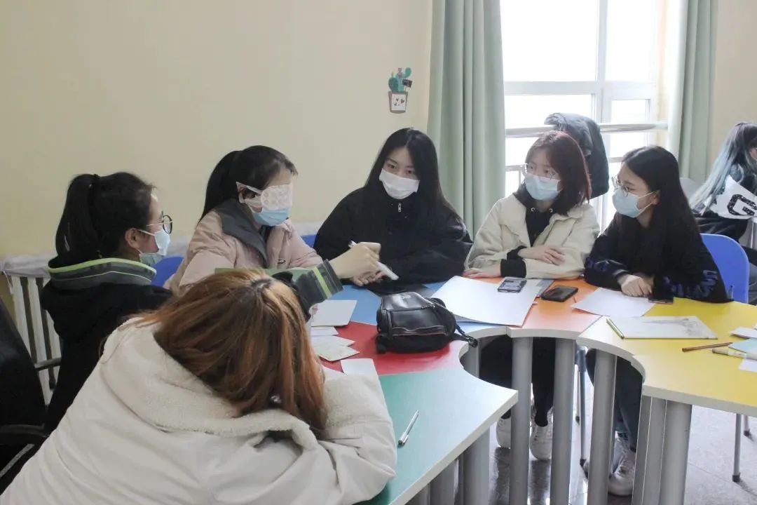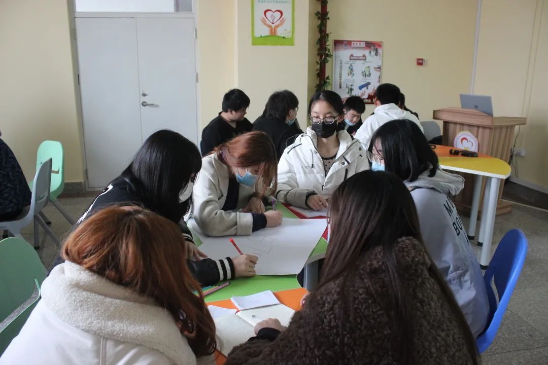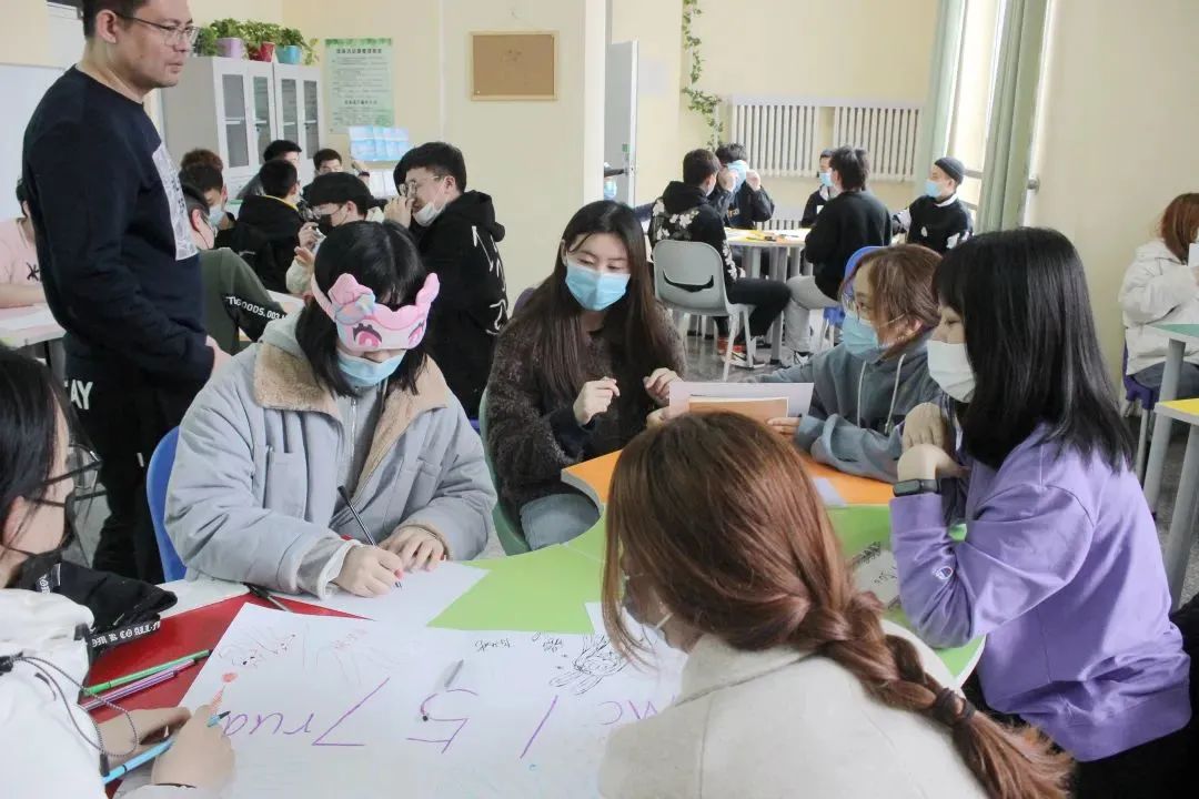 手指游戏活动后,彭老师带领同学们进行团体凝聚力训练活动,以寝室为单位绘画出各自想法的图示,绘制完毕后进行讲解。活动引导同学们交流思想,增加信任,改正不足。