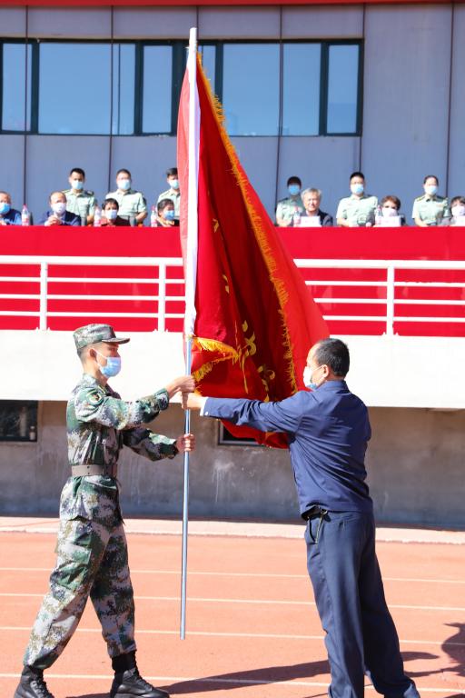 校党委书记林立民向军训团授万博max官网军训团团旗。