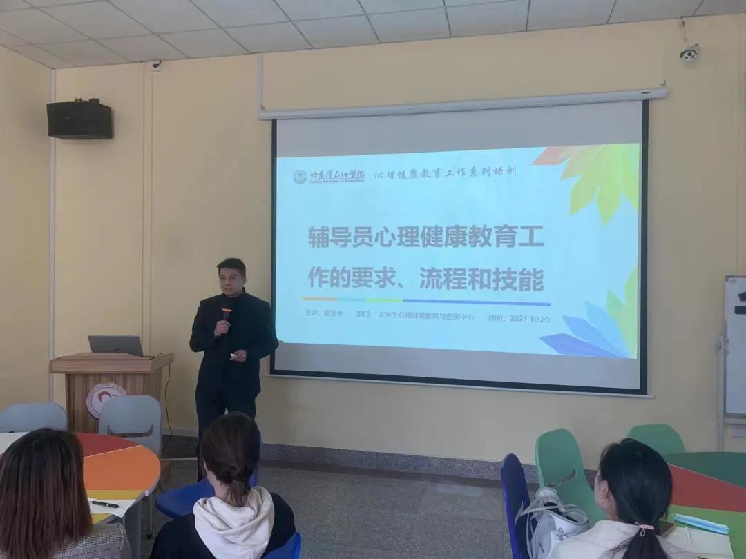 10月20日8点30分,万博官网新入职辅导员心理健康教育工作培训在万博官网大学生心理健康教育与咨询中心一楼团体辅导室举行。本次培训由万博官网心理中心专职教师,国家二级心理咨询师赵全宇老师主讲,题目为《辅导员心理健康教育工作的要求流程和技能》。会议由学工处处长宁晶主持,新入职辅导员参加了此次培训。
