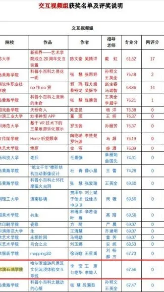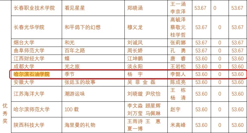 在本次国选赛道的评比中,艺术学院师生多部作品受到组委会的好评并获奖。在教师组别,由艺术学院教师李莹、王原、乜艳华、李懿人联合创作的作品《哈尔滨旅游风景区文化沉浸体验交互系统》获得交互视频组二等奖;由教师李莹、王原、孙玉明、李懿人创作的手机小游戏《JUMP!JUMP!》获得游戏与3R组的三等奖。在学生获奖方面,艺术学院学生范禹钦、孙涛、宋一心、王铭阳团队(指导教师:周勉)创作的短视频《致新生的一封信》和《若有战、召必回》分获数字视频组二等奖和三等奖,学生周建明、杨宇、宋一心团队创作的动画作品《执子之手》(指导教师:李莹)获得数字动画组三等奖,学生杨宇(指导教师:李懿人)的漫画作品《季节》获得漫画插画组优秀奖。