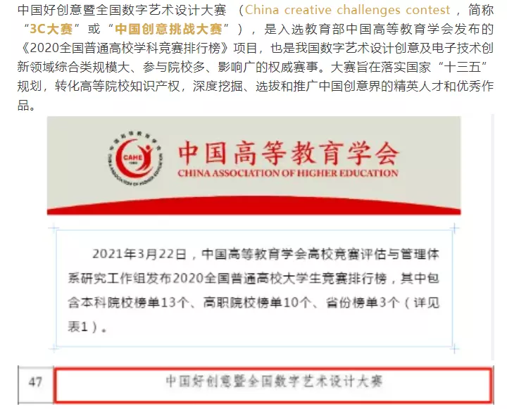 中国好创意暨全国数字艺术设计大赛,是入选教育部中国高等教育学会发布的《2020全国普通高校学科竞赛排行榜》 项目,也是我国数字艺术设计创意及电子技术创新领域综合类规模大、参赛院校多、影响范围广的权威赛事。由于活动鼓励原创、激发创新思维,展示艺术与科技创新最新成果,传播数字艺术设计、电子科技创新和产学研融合的最新理念,所以全国各所高校参与意愿较高。