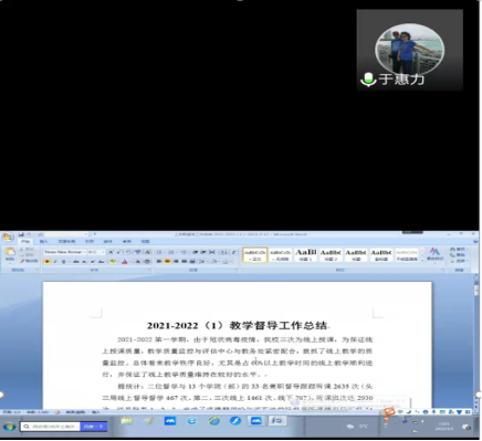 会上,总督学于慧力对2021-2022-1学期的三次线上教学的听评课工作及督导工作做出了全面细致的总结,并对本学期的线上教学工作听课工作进行了布置,还对本学期即将开展的试卷评估、毕业设计(论文)评估等工作提出了有关要求,最后审议了新一届的校督导人员名单,拟报校长办公会审议。