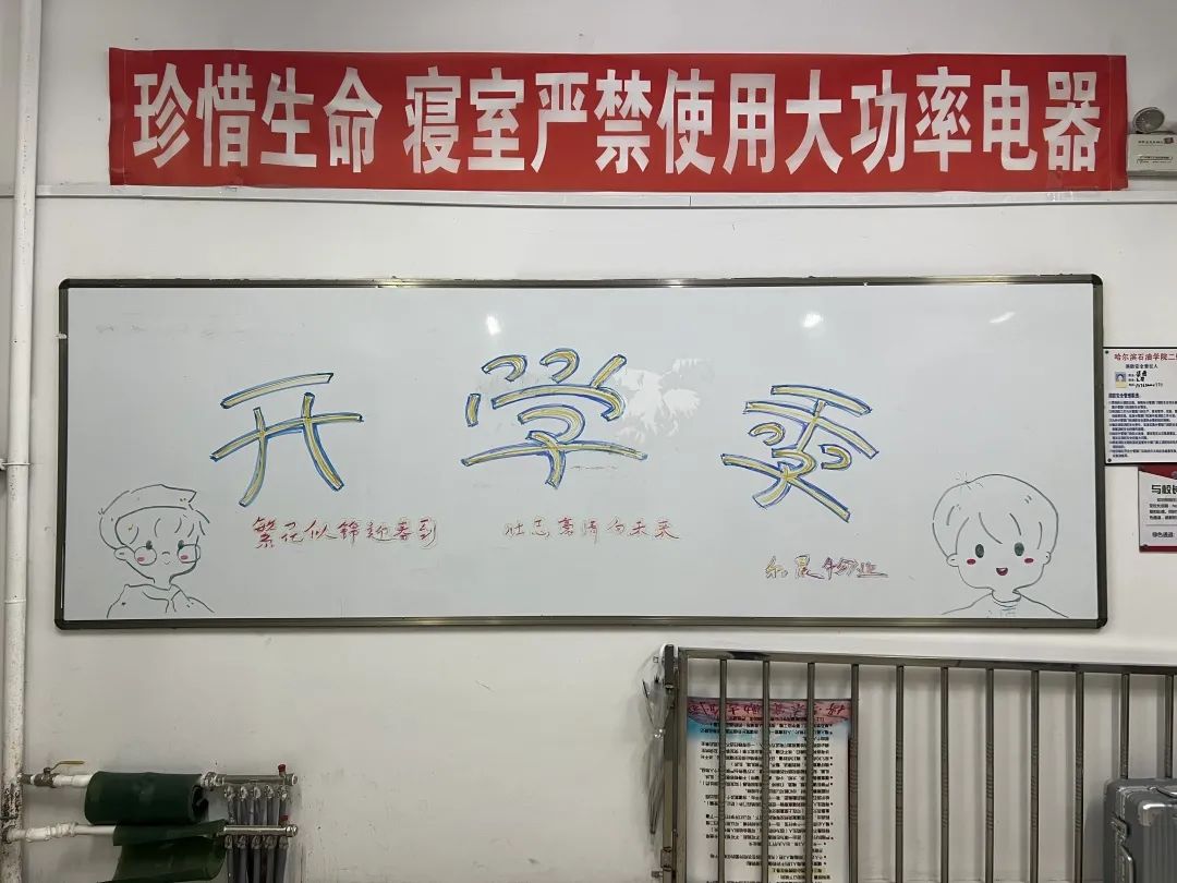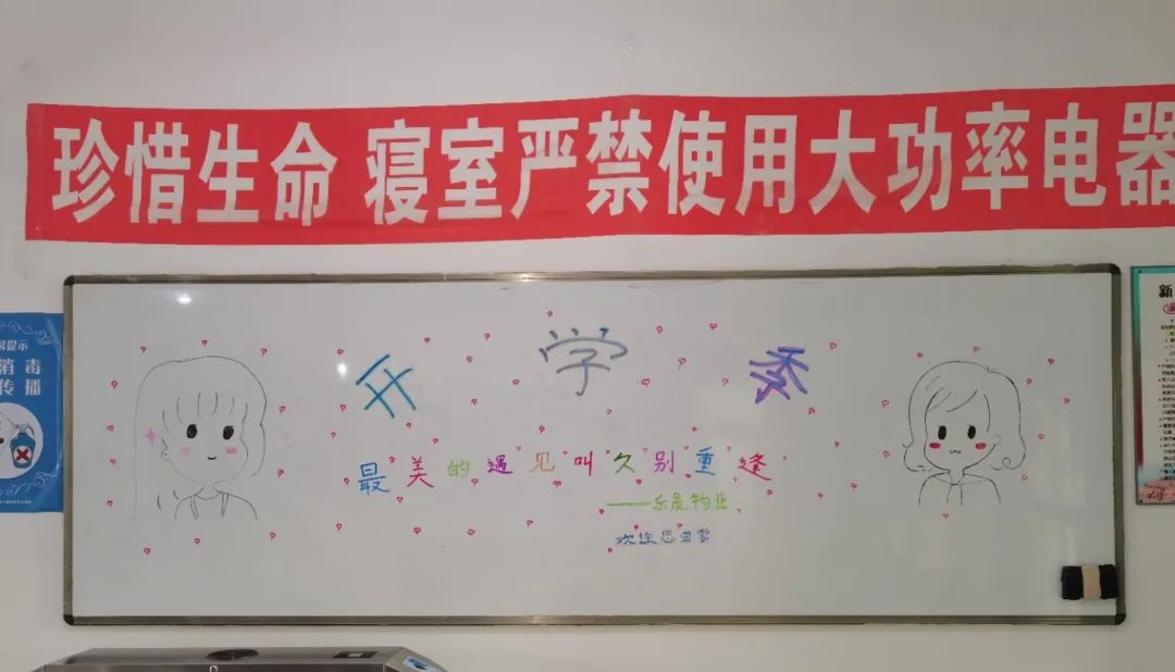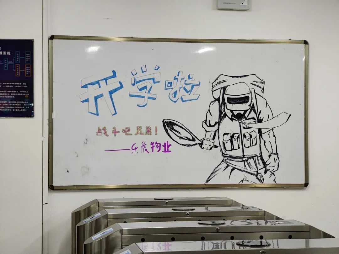 公寓楼宇部主管梁倩就是此次画板报的主力人物,在问及其想法来源时,她说,自己的爱人比较擅长画画,所以在思考如何用行动迎接同学们返校时,她立刻拜师学艺,一边和爱人请教,一边动员宿舍人员动起来,从上网找素材到一张张板报完工,她说非常有成就感,也希望这些爱意满满的板报能给同学们带去温暖。