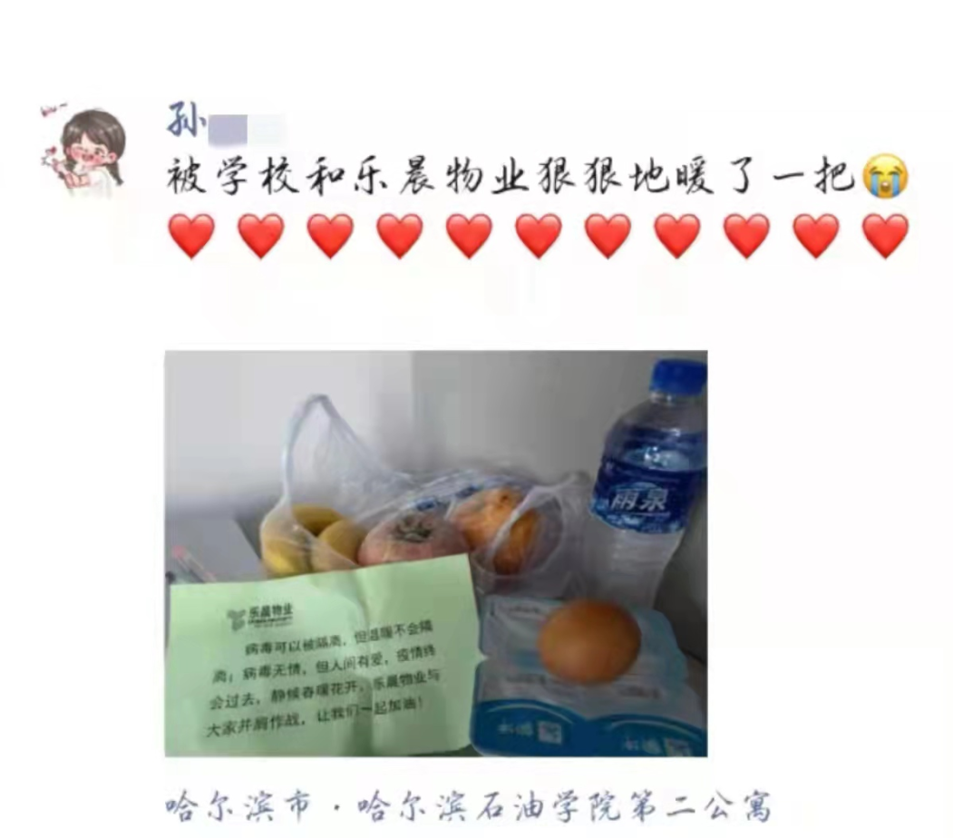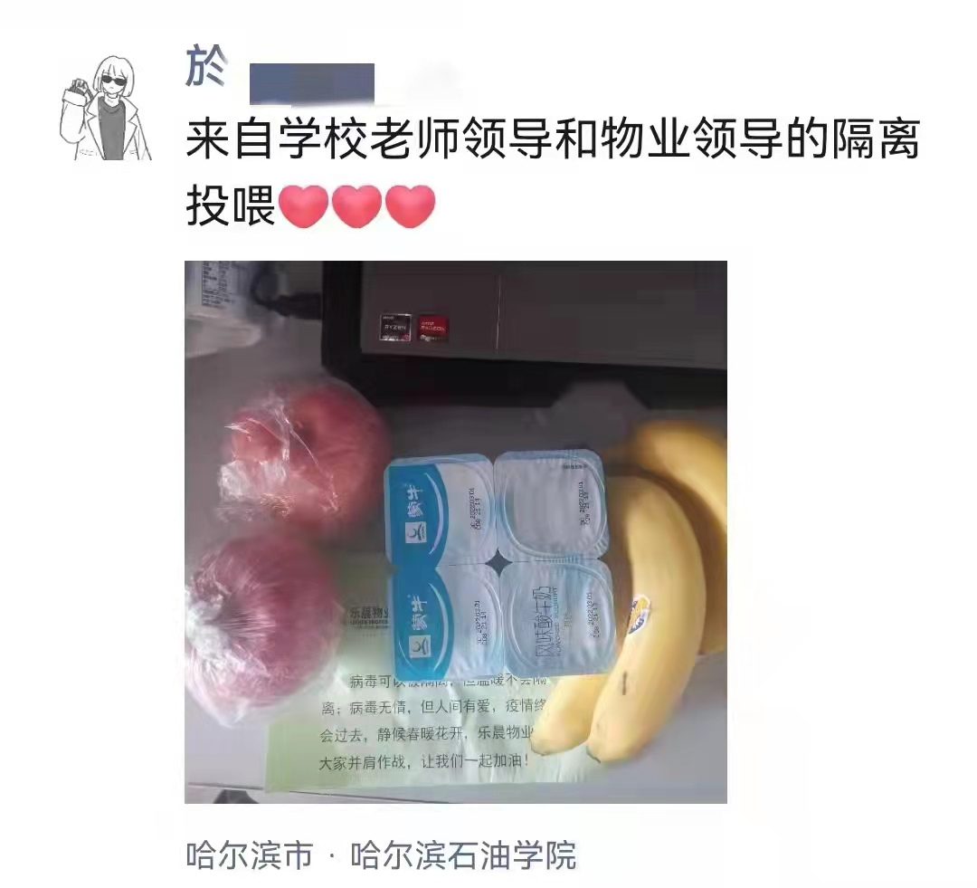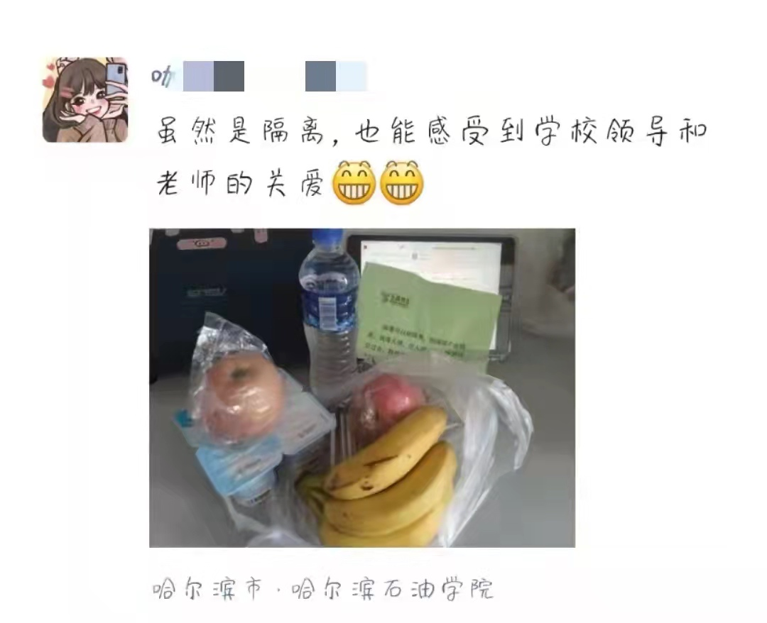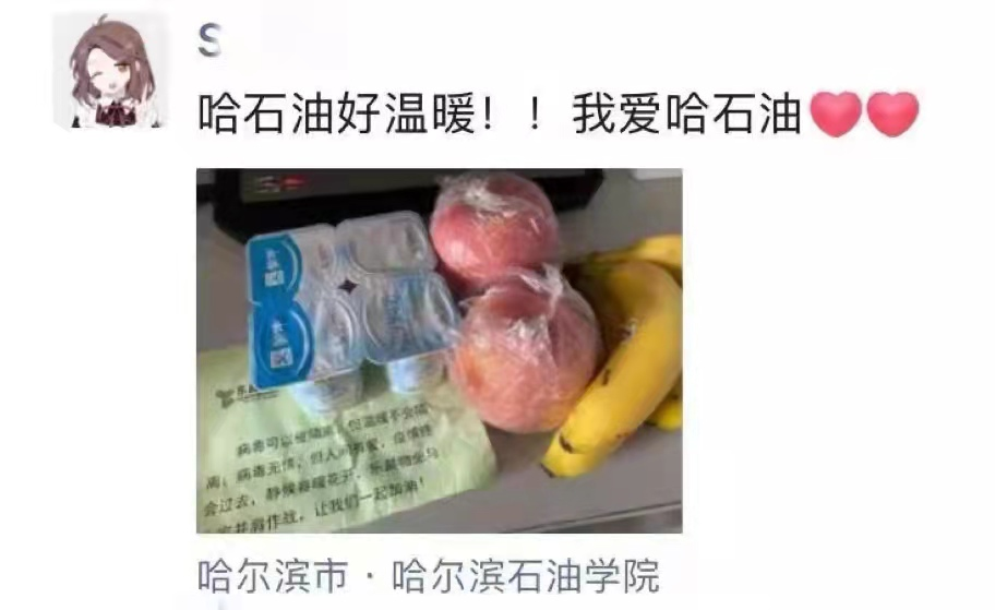 一道隔离门,隔离的是疫情带来的风险隐患,却隔不断哈油教职员工对学生们的关爱之情。同学们在收到“爱心礼包”后,十分感动,反响强烈。自动控制工程学院杨扬同学说,“因为家乡有疫情,所以到校后就直接进入隔离间了,从入校到入住,学校都安排的十分妥当,令我和远在家里的爸爸妈妈都十分感动,学校今天又给我们送来了新鲜的水果和营养品,实在是太暖心、太惊喜了!谢谢学校为我们所做的一切。我们一定积极配合校园防疫工作,顺利度过这段“孤独但幸福着”的隔离期。”