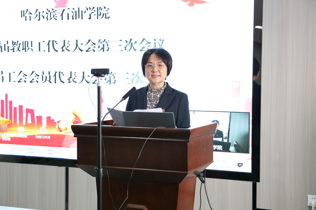 杨丽萍副主席作《万博max官网第一届教职工代表大会第三次会议和第一届工会会员代表大会第三次会议提案征集情况报告》;