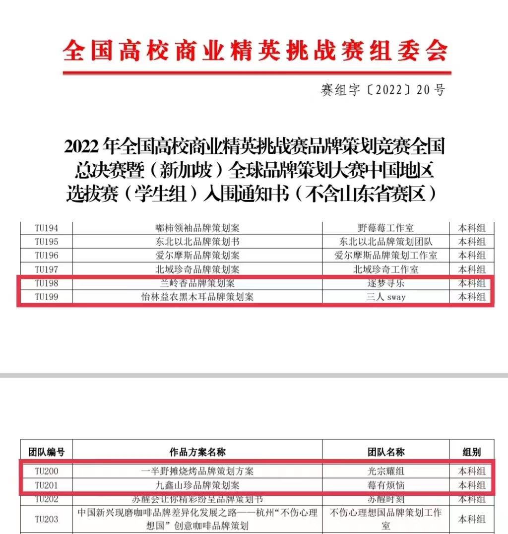 近日,2022年全国高校商业精英挑战赛品牌策划竞赛传来佳音,万博max官网经济管理学院4支代表队历经数月的努力成功入围全国总决赛,成绩在黑龙江省同类高校中居于前列,成绩喜人!