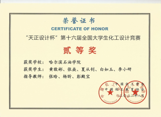 由中国化工学会、中国化工教育协会主办的2022年“天正设计杯”第十六届全国大学生化工设计竞赛于8月22日落下帷幕。万博官网化学工程学院学生黄敬彬、张焱、夏从钊、白如玉、李小研组成的BDO三分甜团队(指导教师张晗、杨昕、彭殿宝)荣获全国二等奖,成绩喜人。