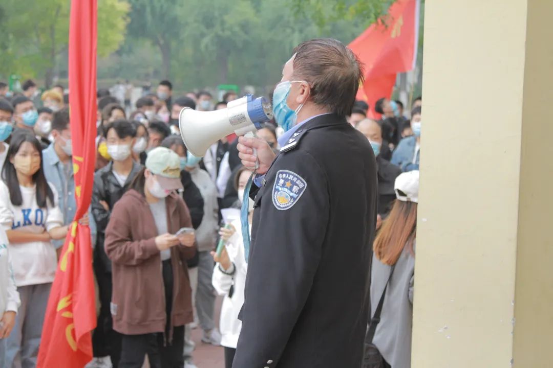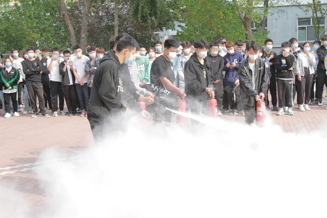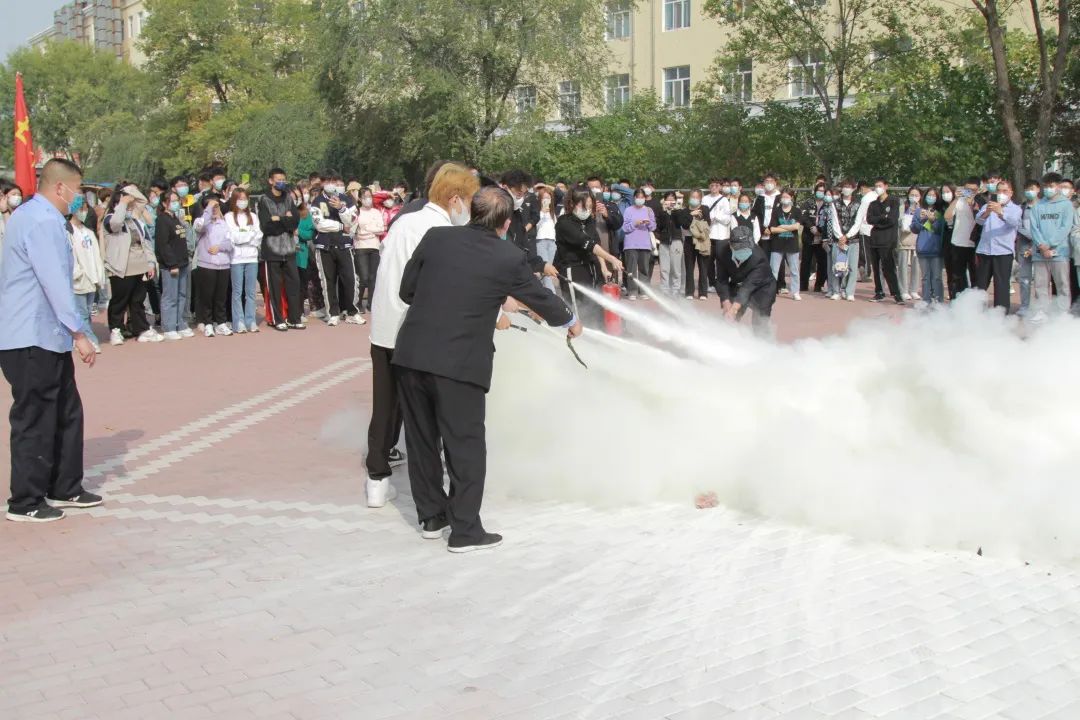 首先保卫处副处长张学斌对全体学生做动员讲话并提出演练要求。随后,保卫处王老师为参演人员讲解了有关火灾防范、初级火灾的扑救、火场逃生、火场自救等知识,并向学生们演示了灭火器使用步骤及灭火技巧,科学讲解初期火灾的扑救方法。