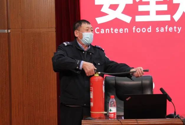 会上由保卫处消防科科长赵胜林为现场所有食品生产一线工作人员讲解了生产消防安全及要求,保卫处王岗同志生动形象的在现场示范了如何正确灭火及逃生。