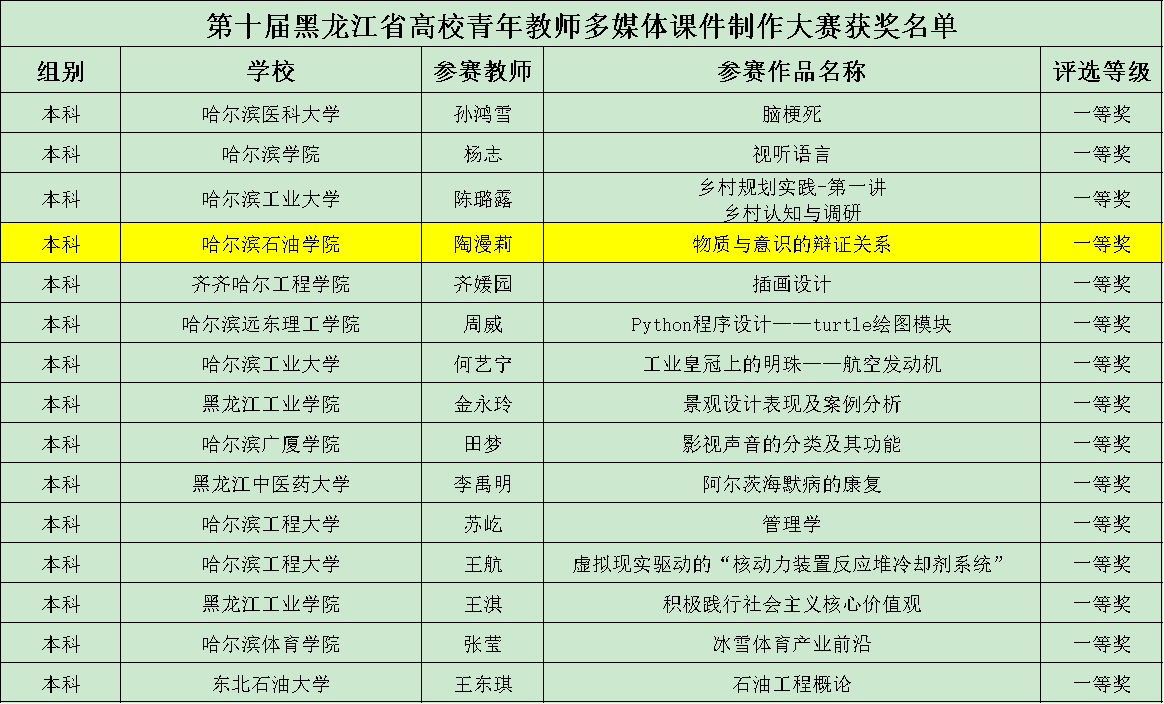 近日,由黑龙江省高校师资培训中心、教育部全国高校教师网络培训黑龙江省分中心联合举办的“第十届黑龙江省高校教师多媒体课件制作大赛”落下帷幕。经过一系列严格的专家组评审,万博官网马克思主义学院陶漫莉老师荣获本科组一等奖。