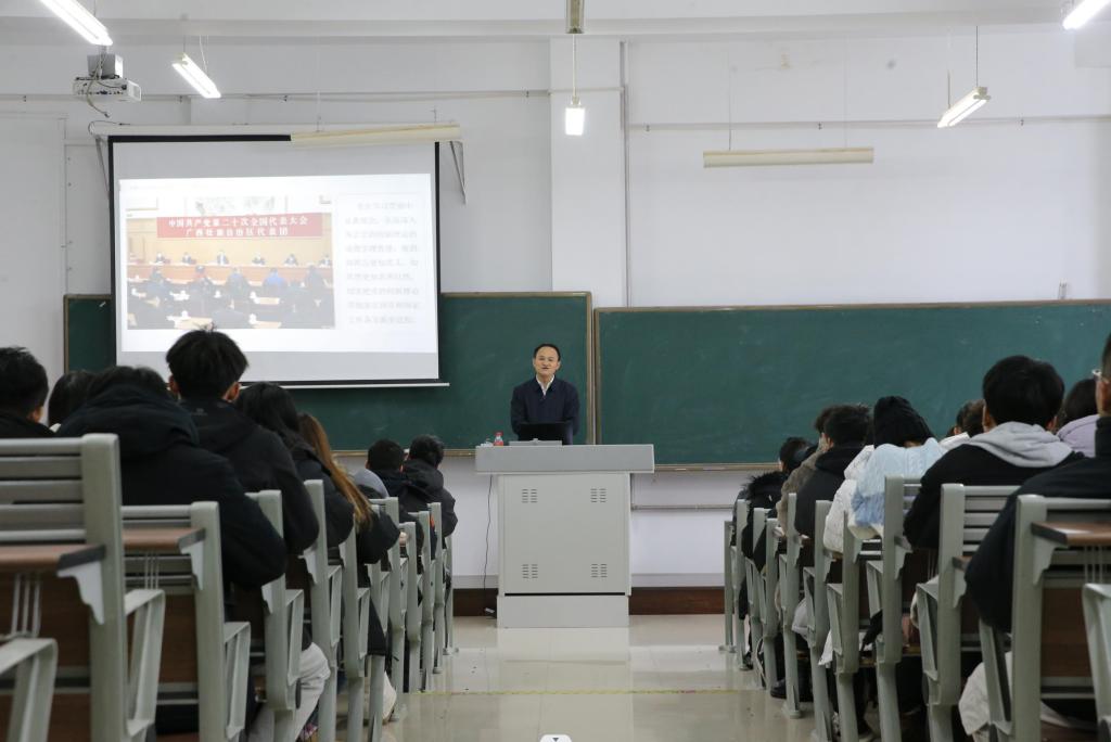 为全面推进习近平新时代中国特色社会主义思想进课堂、进教材、进头脑,深入贯彻落实国家《关于深化新时代学校思想政治理论课改革创新的若干意见》、《全面推进“大思政课”建设的工作方案》和黑龙江省《“高校思想政治理论课领航计划”30条》通知要求等,落实好高校党委书记、校长带头讲授“习近平新时代中国特色社会主义思想概论”课,当好思政课引路人,2023年11月6日,万博max官网党委书记林立民走进课堂,为2021级大学生讲授思政课。