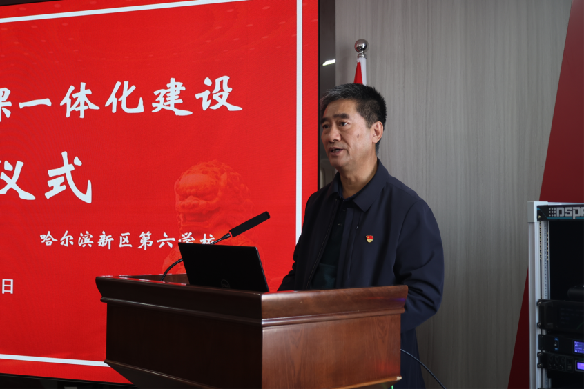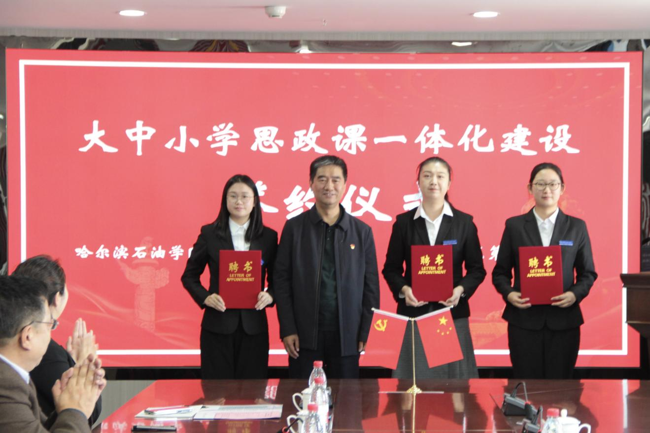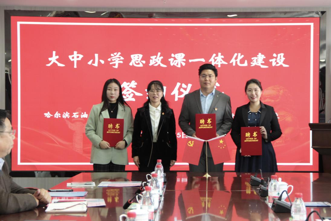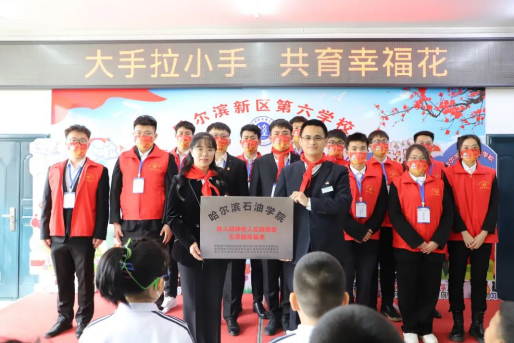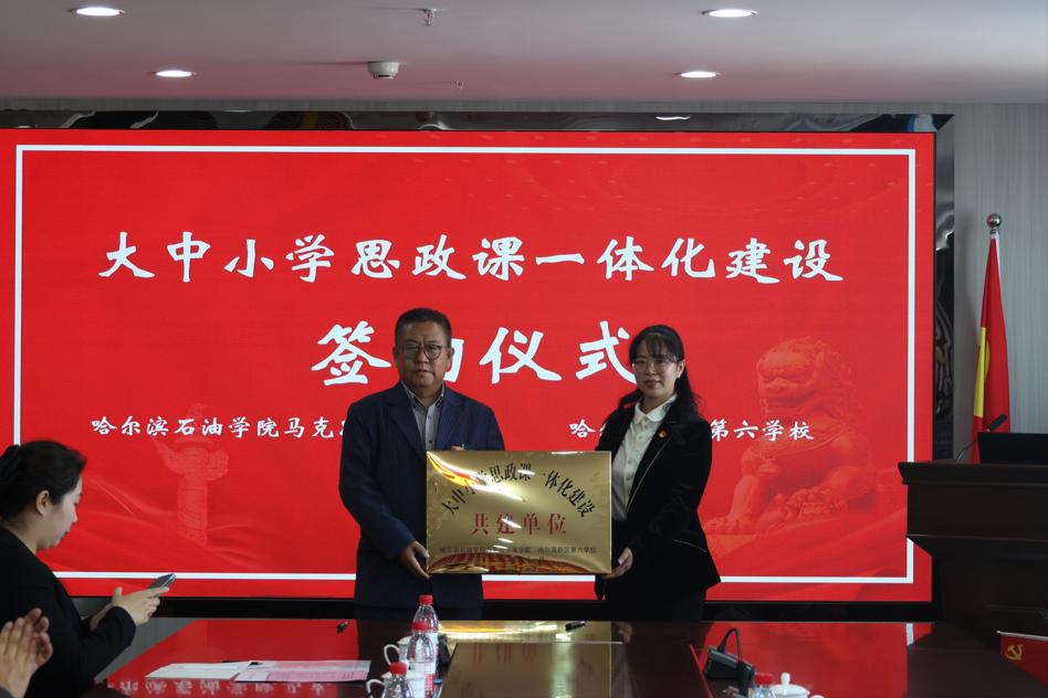 在活动现场,马克思主义学院院长吴卫东和哈尔滨新区第六学校校长范勇签订了“大中小学思政课一体化共建协议书”,并共同为“大中小学思政课一体化建设共建单位”揭牌。石油工程学院作为大中小学思政课一体化建设共建基地,以全校开展“铁人先锋党建”工程为契机,结合学院工作实际,强化党的政治引领作用,通过“铁人精神育人”党建品牌的创建,与哈尔滨新区第六学校建立起了铁人精神育人实践基地和志愿服务基地,大力推进思想政治成果的实际转化和运用。