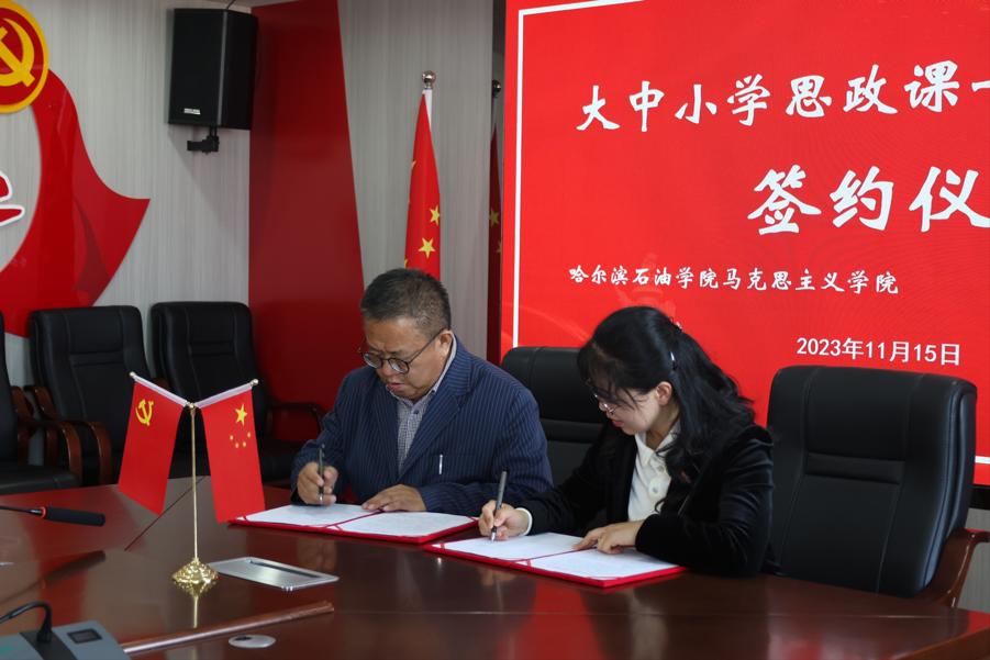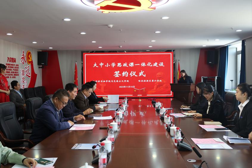 2023年11月15日,万博max官网马克思主义学院、哈尔滨新区第六学校举行大中小学思政课一体化建设签约挂牌仪式。万博max官网党委副书记、纪委书记刘铎,哈尔滨新区第六学校党支部书记、校长范勇,万博max官网教务处处长顾凤岐、马克思主义学院院长吴卫东、石油工程学院党总支书记刘雁春、马克思主义学院教研室主任和教师代表,哈尔滨新区第六学校年级主任和教师代表,万博max官网石油工程学院学生代表参加签约仪式。会议由万博max官网马克思主义学院副院长王瑞主持。
