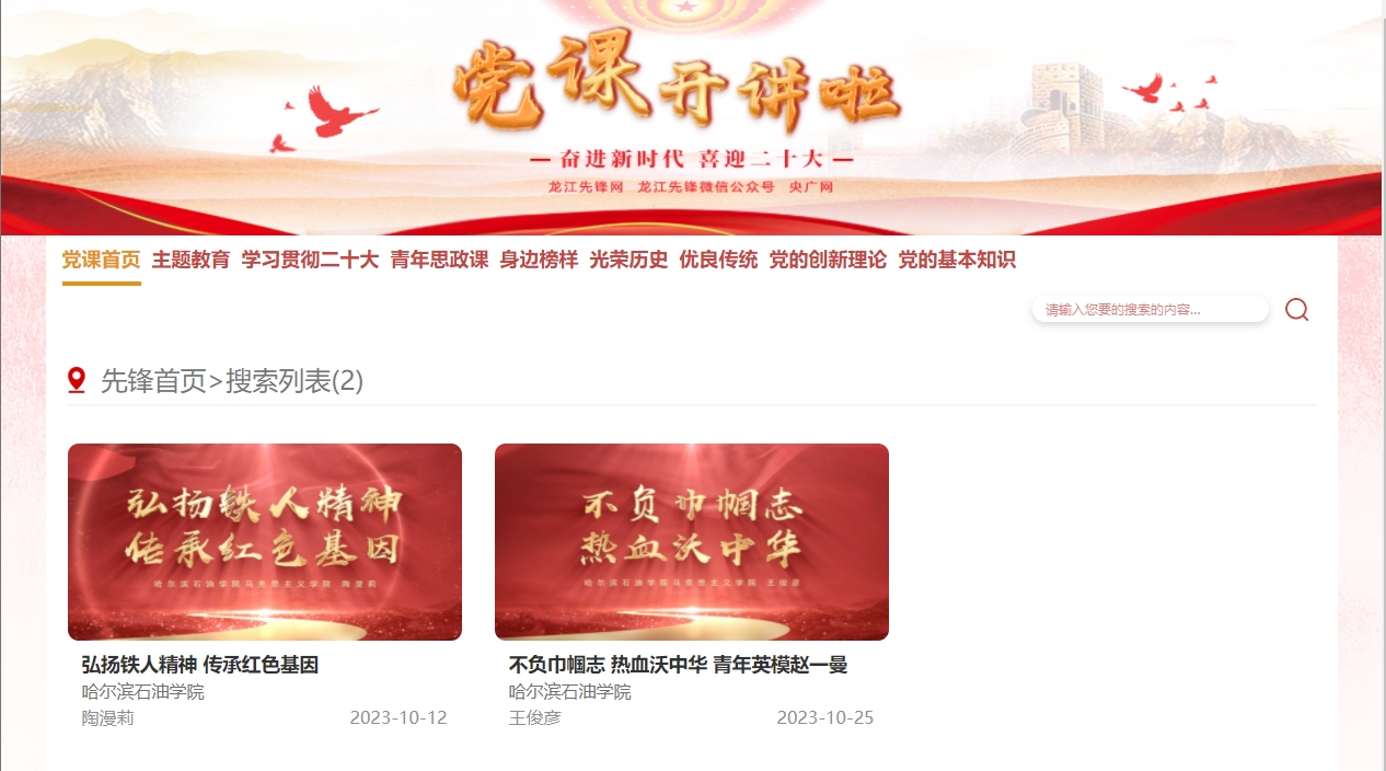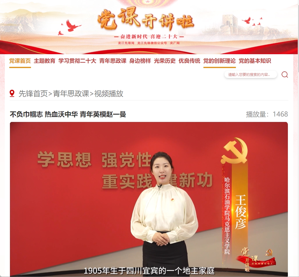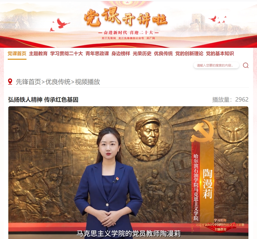 近日,由万博官网马克思主义学院教师王俊彦讲授的党课《不负巾帼志 热血沃中华——青年英模赵一曼》、教师陶漫莉讲授的党课《弘扬铁人精神传承红色基因》入选省委组织部“党课开讲啦”精品党课,并在龙江先锋网在线展播。