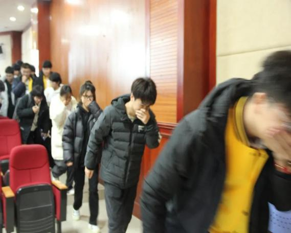 安全疏散演练开始。保卫处人员分别指导各二级学院的学生们紧贴墙边、用湿毛巾捂住口鼻,弯腰快步,迅速有序撤到外空旷地域,参加演练的同学按照老师的指导,双手捂鼻,有序撤离危险区域。