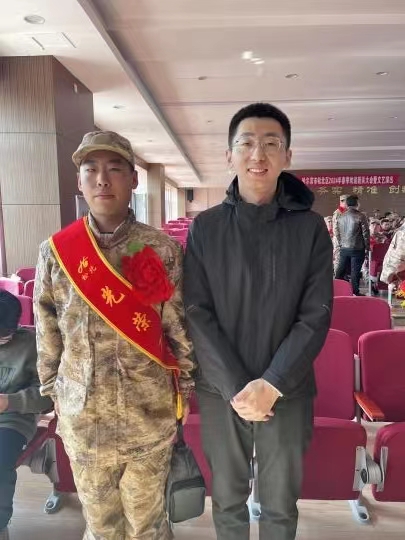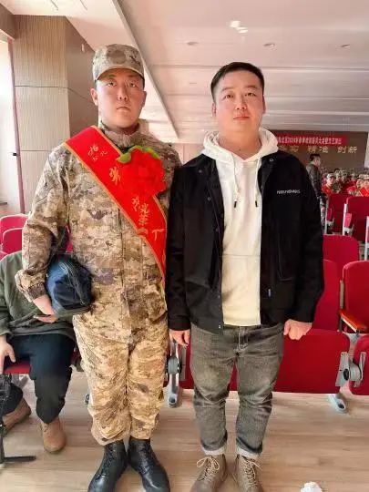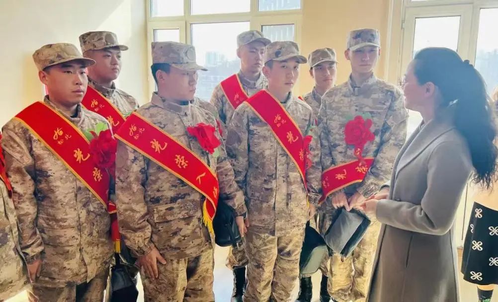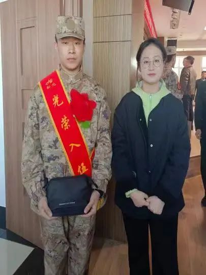 与会领导和老师为入伍新兵佩戴大红花,并颁发了纪念品。辅导员老师与即将入伍的同学亲切交谈,鼓励他们在军队的大熔炉里锤炼意志、磨炼性格、苦练本领,争做对党忠诚、政治合格的新时代军人。