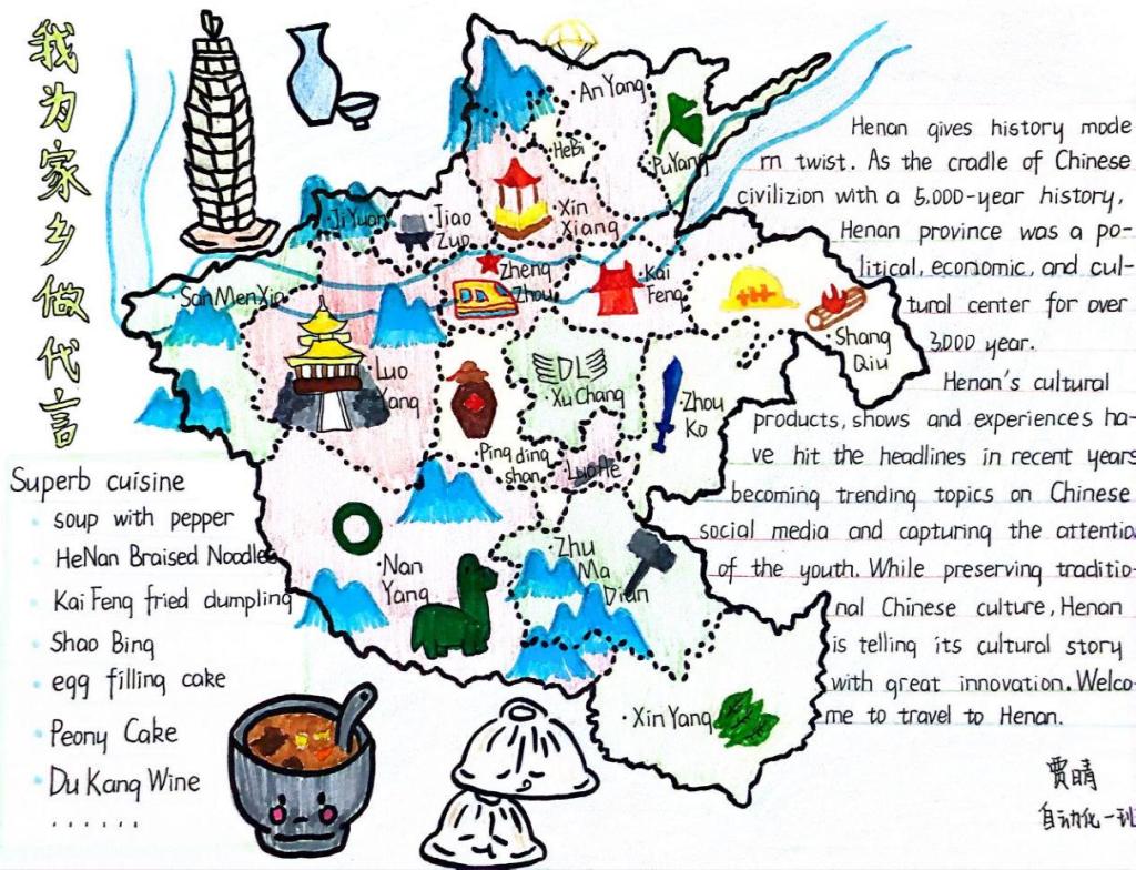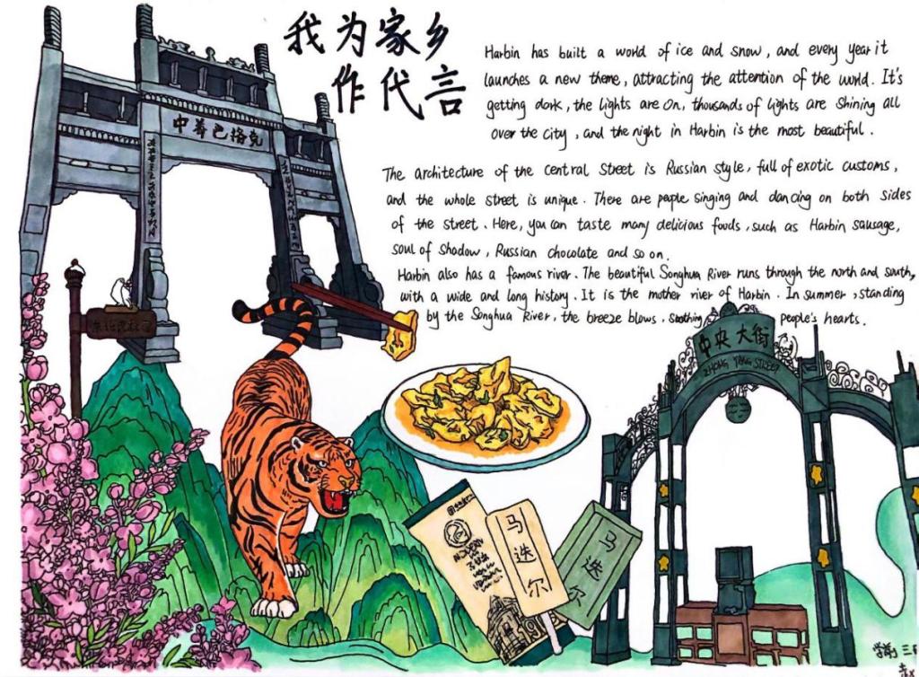 万博官网学生们来自五湖四海,中国故事亦是每个城市的小故事,参赛学生聚焦家乡,发掘家乡城市发展、地域文化、风土民俗、特色饮食等。他们作为家乡发展变化的经历者、见证者,怀揣着对家乡的热爱,为家乡对外宣传出一份力,为中国故事的传承发掘丰富了内容。学生通过画笔和英语文字,多维度、广角度地呈现了大美中国,故乡风韵,用活泼生动的画面展示了中国面貌,进一步激发起学子内心的幸福感和国家强盛的自豪感。