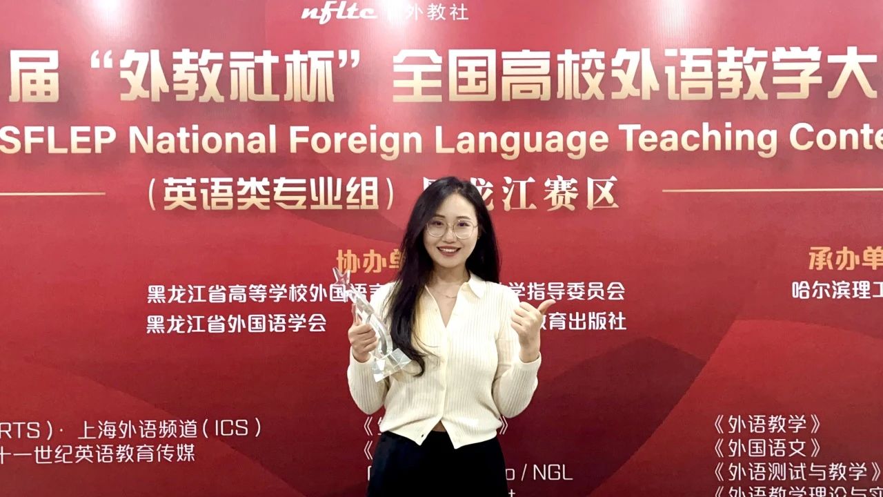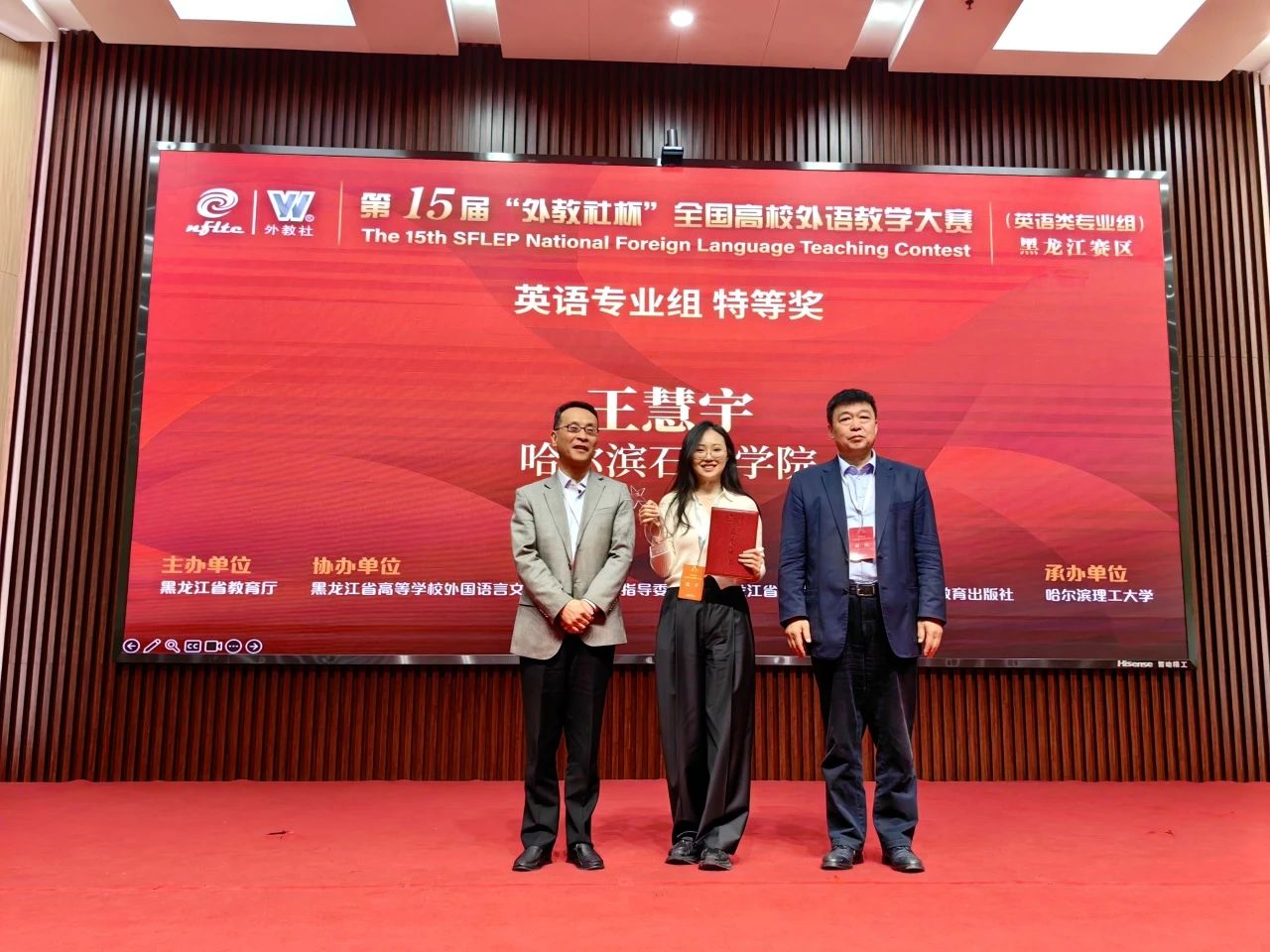 6月1日,第十五届“外教社杯”全国高校外语教学大赛黑龙江省赛区决赛在哈尔滨理工大学成功举办。本次大赛由黑龙江省教育厅主办,黑龙江省高等学校外国语言文学类专业教学指导委员会和上海外语教育出版社协办,哈尔滨理工大学承办。比赛分为英语专业组和商务英语专业组两个组别,经过全省各本科院校层层选拔,来自省内29所高校的47位老师进入了复赛,最后,17位老师成功晋级决赛。万博官网外国语学院英语系青年教师王慧宇,凭借优秀的教学设计和出色的专业素养在英语专业组的众多选手中脱颖而出,荣获黑龙江赛区英语类专业组特等奖,并将在下半年代表黑龙江省参加全国决赛。