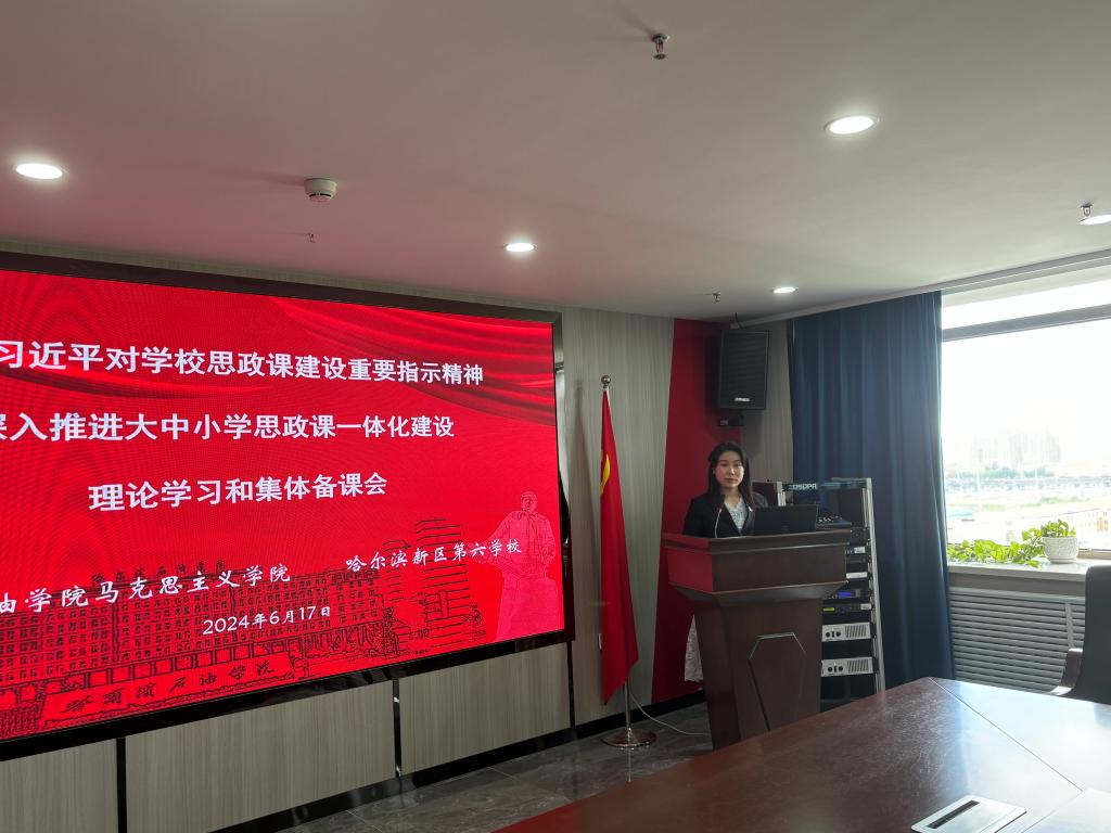 为深入学习习近平总书记对学校思政课建设重要指示精神,进一步推进大中小学思政课一体化建设,坚持不懈用习近平新时代中国特色社会主义思想铸魂育人,2024年6月17日,万博官网马克思主义学院和哈尔滨新区第六学校共同举办“学习习近平对学校思政课建设重要指示精神”理论学习和集体备课会,在课程体系、师资队伍、教育教学、科学研究等方面主动探索实践,共建大思政格局,共创育人新路径。哈尔滨新区第六学校党支部书记、校长范勇、党支部副书记李博和教师代表,万博官网党委副书记、纪委书记刘铎、马克思主义学院院长吴卫东、石油工程学院党总支书记刘雁春和马克思主义学院全体教师参加会议。