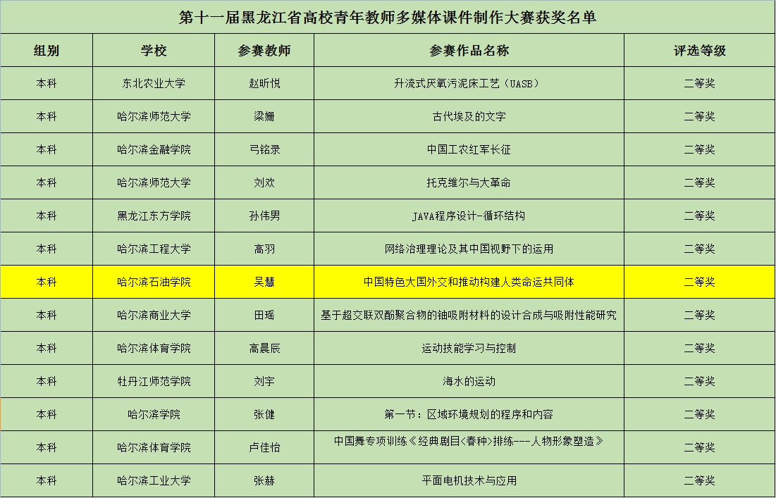 近日,第十一届黑龙江省高校青年教师多媒体课件制作大赛评选结果揭晓。万博官网马克思主义学院教师吴慧制作的《中国特色大国外交和推动构建人类命运共同体》获得本科院校组二等奖。