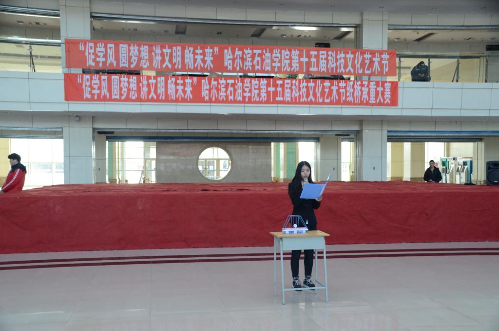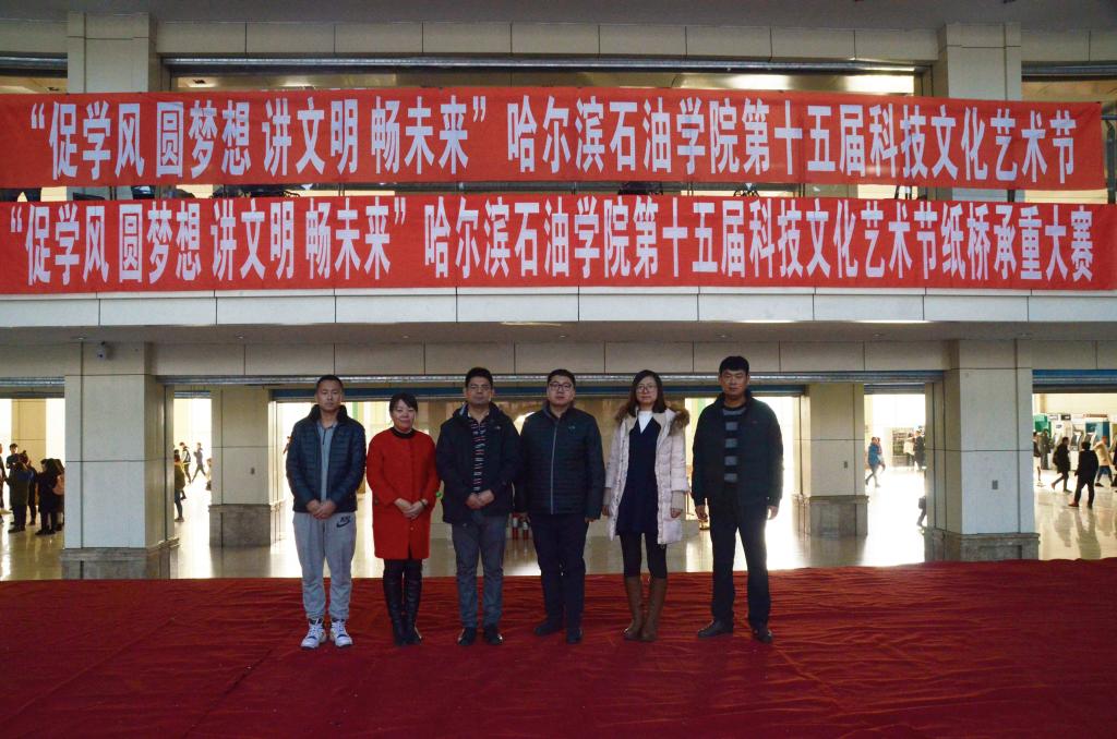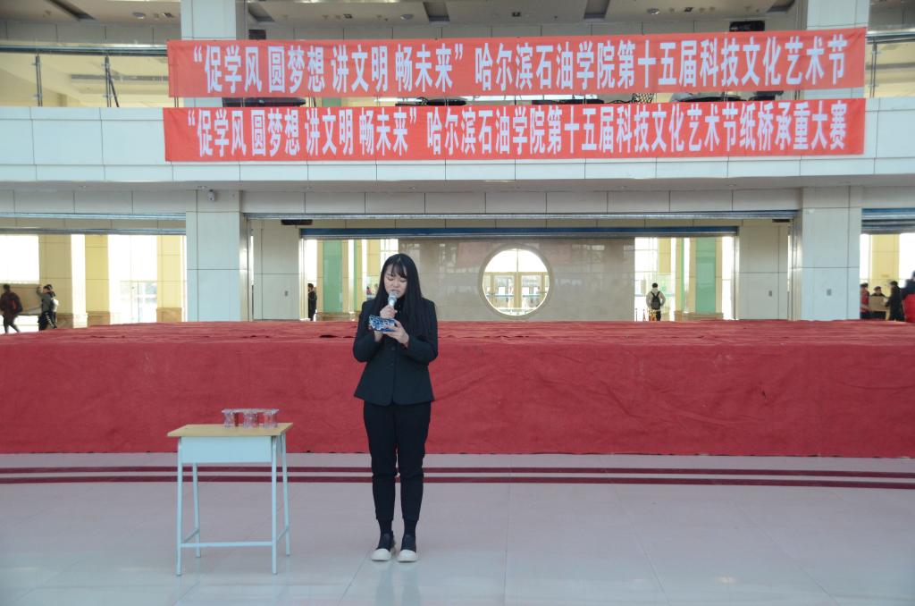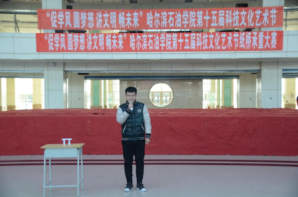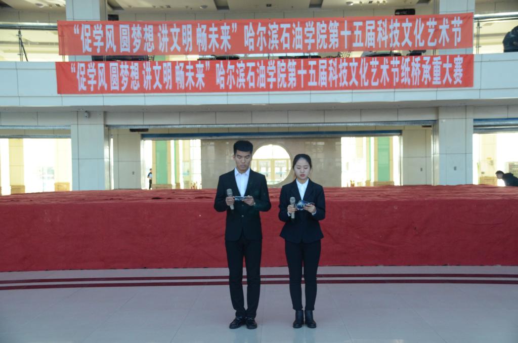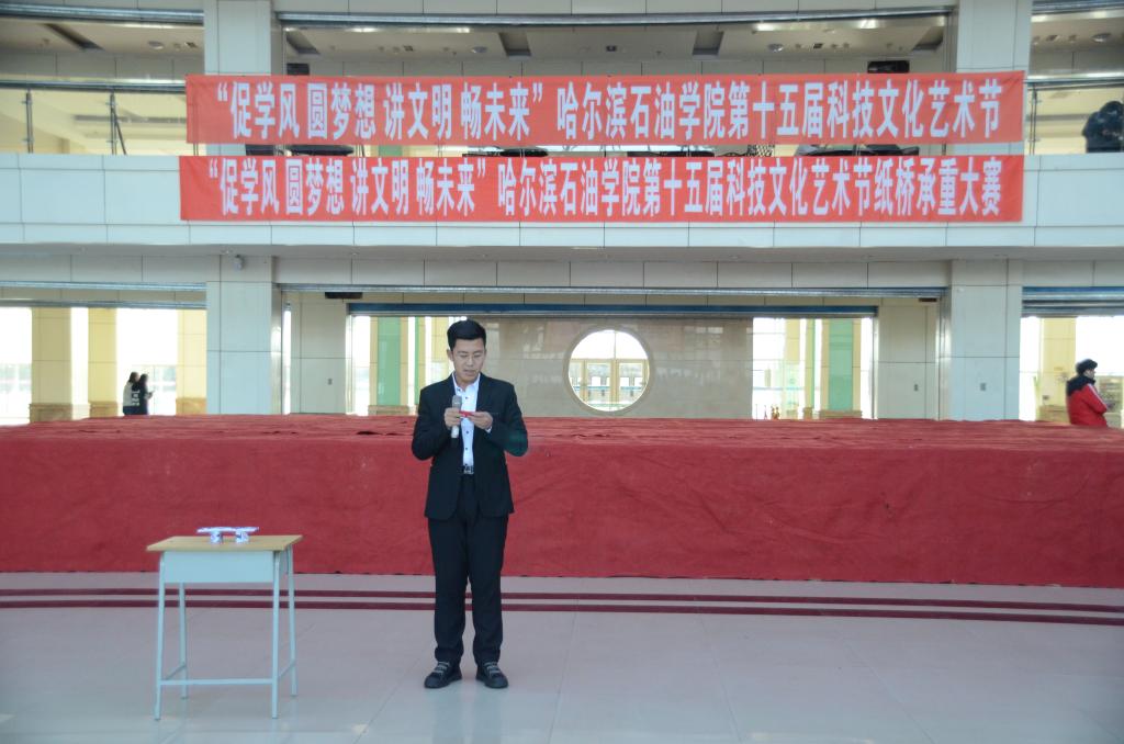 11月15日中午12点,由校团委主办,石油工程学院承办的第十五届科技文化艺术节活动之“纸桥承重”大赛在主教阳光大厅正式举行。石油工程学院党总支副书记康平军,校团委副书记彭雷以及各二级学院团总支书记和学生会主席出席了本次活动。