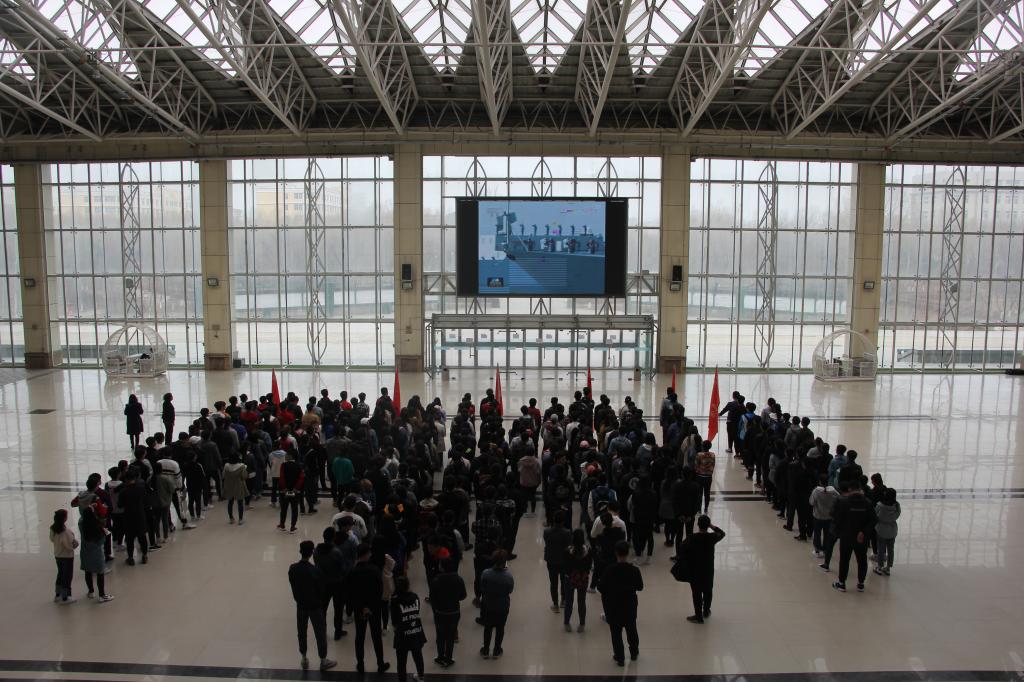 为进一步激发师生的爱国主义热情,2018年4月13日12时20分,万博官网组织师生在主教学楼阳光大厅集中观看南海海域大阅兵视频。