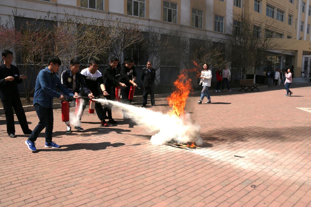 在演练之前,保卫处就火灾的防范、初级火灾的扑救、火场逃生、火场自救等常识进行了讲解,随后学生志愿者在保卫处工作人员的指导下,对初级火灾进行了扑救演练。