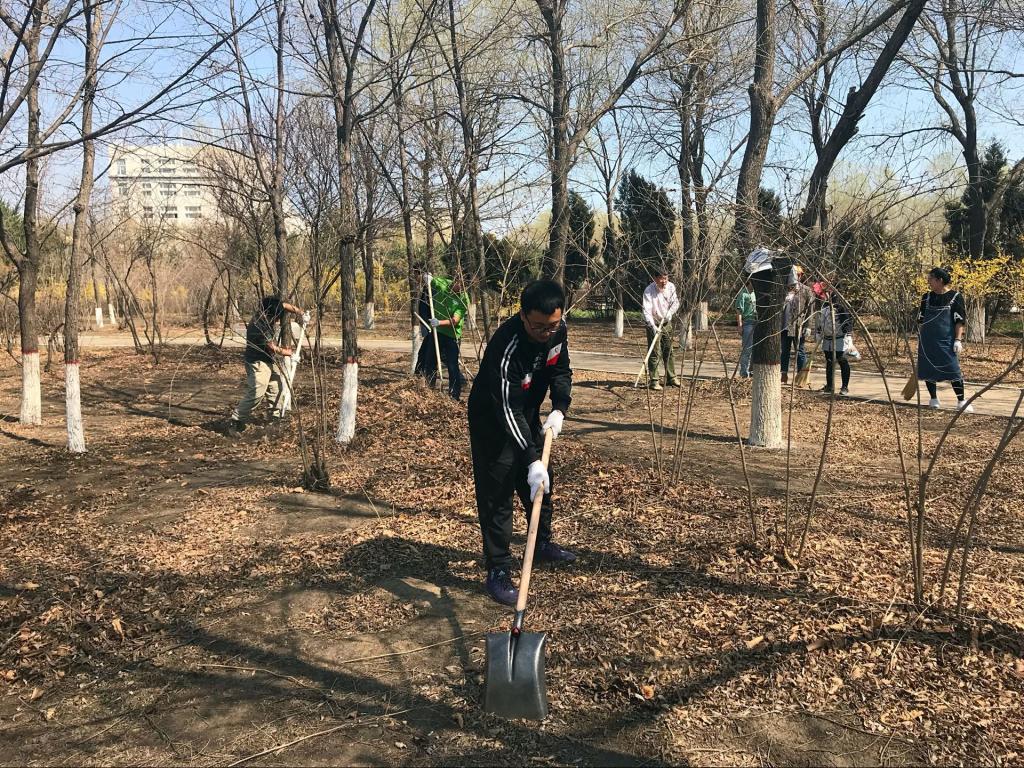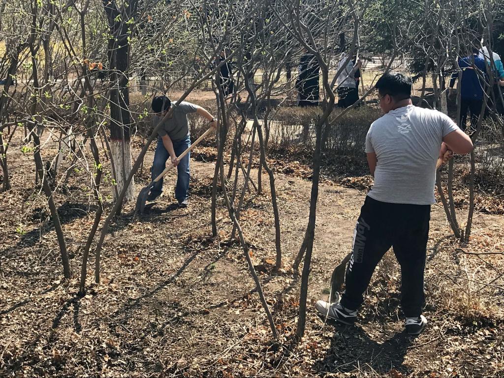 在校园主楼后花园内,全校教职工分成几个小组,大家拿着铁锹、耙子、扫帚等工具,将花园里残留的垃圾、纸屑和枯枝断叶清扫到一堆,装到垃圾袋里清走。通过全校教职工的齐心协力,校园环境得到了进一步提升。