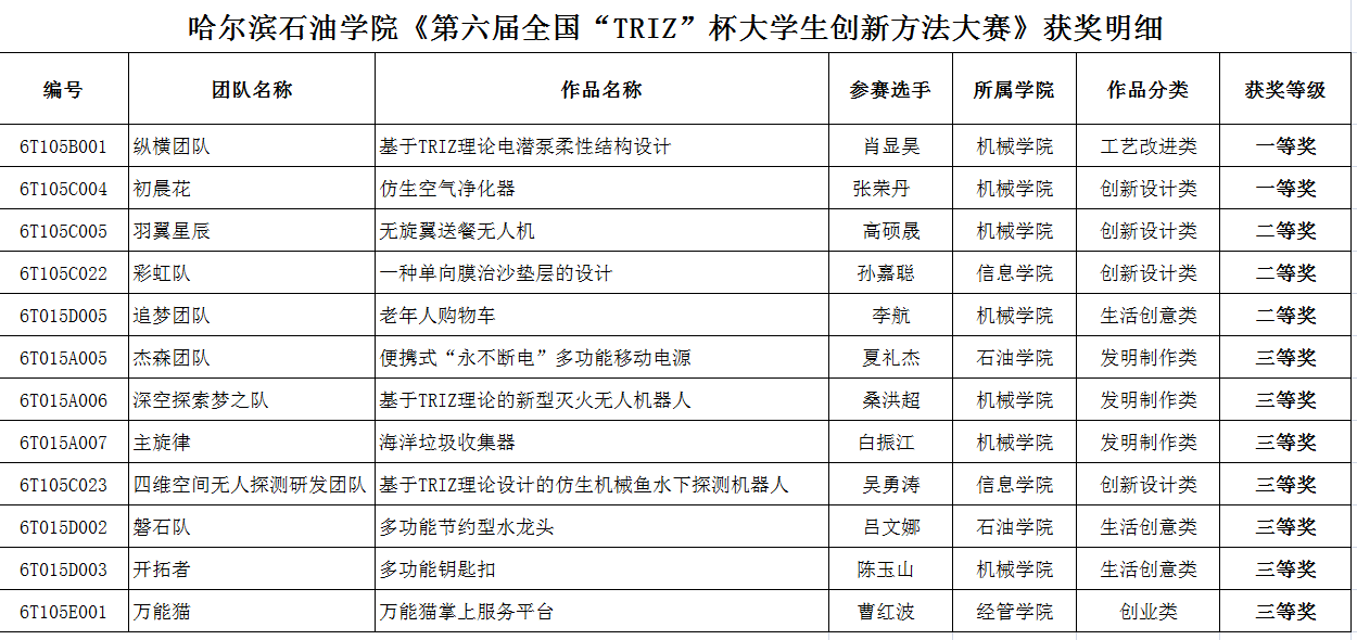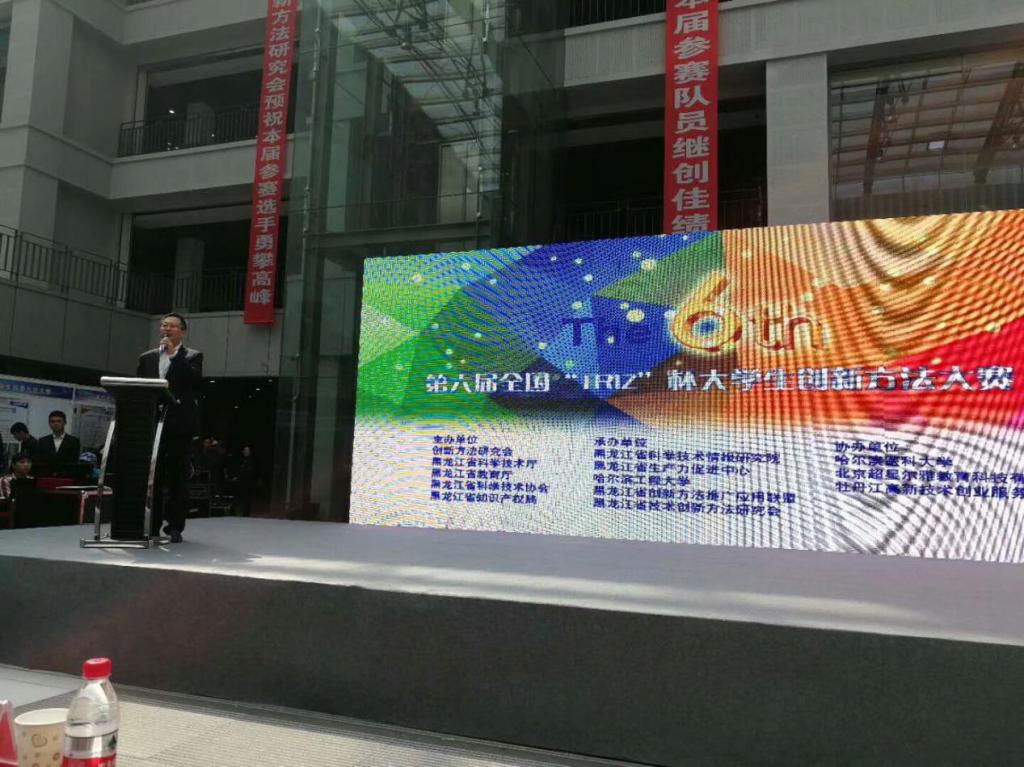 2018年5月12日至5月13日,以“创新引领未来,创业成就梦想”为主题的第六届全国“TRIZ”杯大学生创新方法大赛总决赛在哈尔滨举行。本次大赛是由创新方法研究会、黑龙江省科学技术厅、黑龙江省教育厅、黑龙江省科学技术协会和黑龙江省知识产权局联合主办,黑龙江省技术创新方法研究会、黑龙江省科学技术情报研究院、黑龙江省生产力促进中心和哈尔滨工程大学联合承办的一项运用“TRIZ”创新方法进行创新创业的全国竞赛活动。副校长冯研,科研处处长王妍玮,创业教研室负责人夏长元出席决赛。